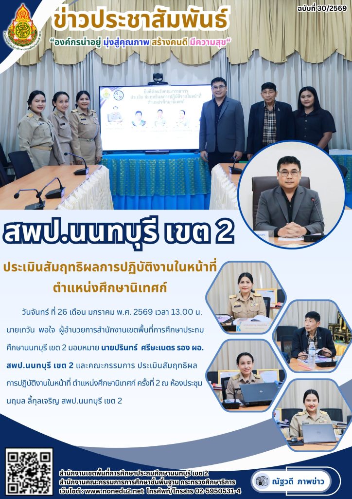วันจันทร์ ที่ 26 เดือน มกราคม พ.ศ. 2569 เวลา 13.00 น. นายเทวัน พอใจ ผู้อำนวยการสำนักงานเขตพื้นที่การศึกษาประถมศึกษานนทบุรี เขต 2 มอบหมาย นายปรินทร์ ศรีษะเนตร รอง ผอ.สพป.นนทบุรี เขต 2 และคณะกรรมการ ประเมินสัมฤทธิผลการปฏิบัติงานในหน้าที่ ตำแหน่งศึกษานิเทศก์ ครั้งที่ 2 ณ ห้องประชุมนฤมล ลี้กุลเจริญ สพป.นนทบุรี เขต 2