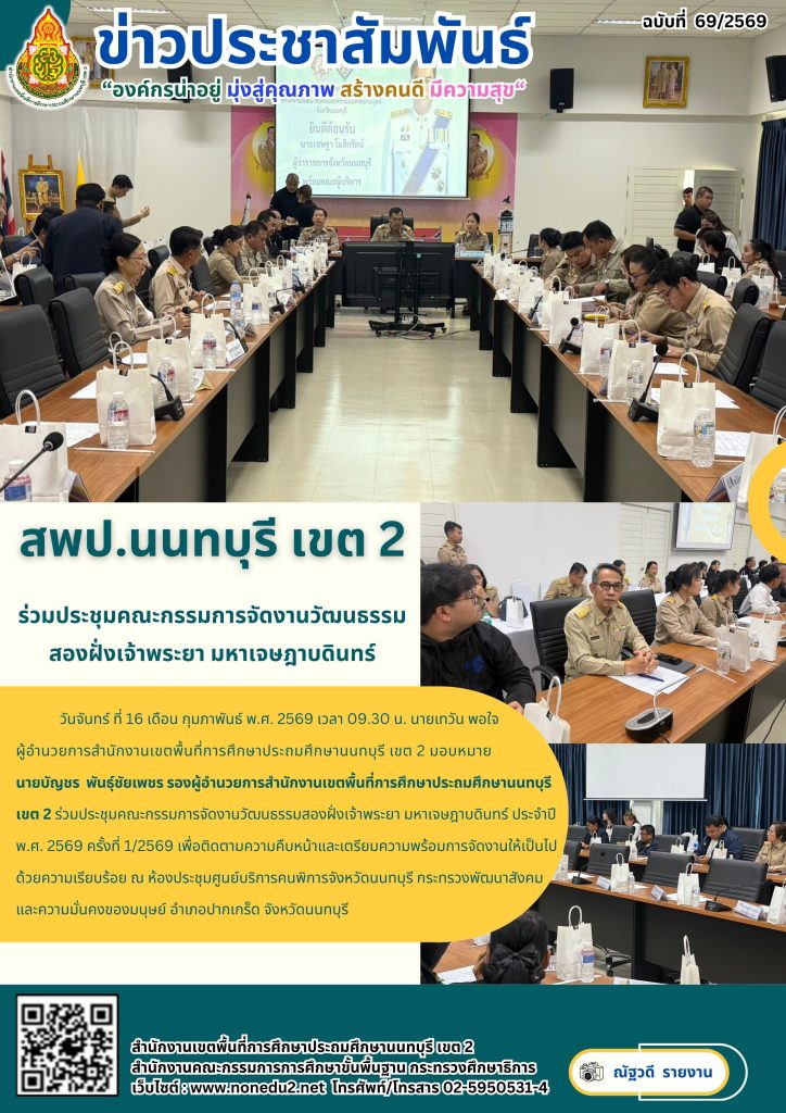 วันจันทร์ ที่ 16 เดือน กุมภาพันธ์ พ.ศ. 2569 เวลา 09.30 น. นายเทวัน พอใจ ผู้อำนวยการสำนักงานเขตพื้นที่การศึกษาประถมศึกษานนทบุรี เขต 2 มอบหมาย นายบัญชร พันธุ์ชัยเพชร รองผู้อำนวยการสำนักงานเขตพื้นที่การศึกษาประถมศึกษานนทบุรี เขต 2 ร่วมประชุมคณะกรรมการจัดงานวัฒนธรรมสองฝั่งเจ้าพระยา มหาเจษฎาบดินทร์ ประจำปี พ.ศ. 2569 ครั้งที่ 1/2569 เพื่อติดตามความคืบหน้าและเตรียมความพร้อมการจัดงานให้เป็นไปด้วยความเรียบร้อย ณ ห้องประชุมศูนย์บริการคนพิการจังหวัดนนทบุรี กระทรวงพัฒนาสังคมและความมั่นคงของมนุษย์ อำเภอปากเกร็ด จังหวัดนนทบุรี