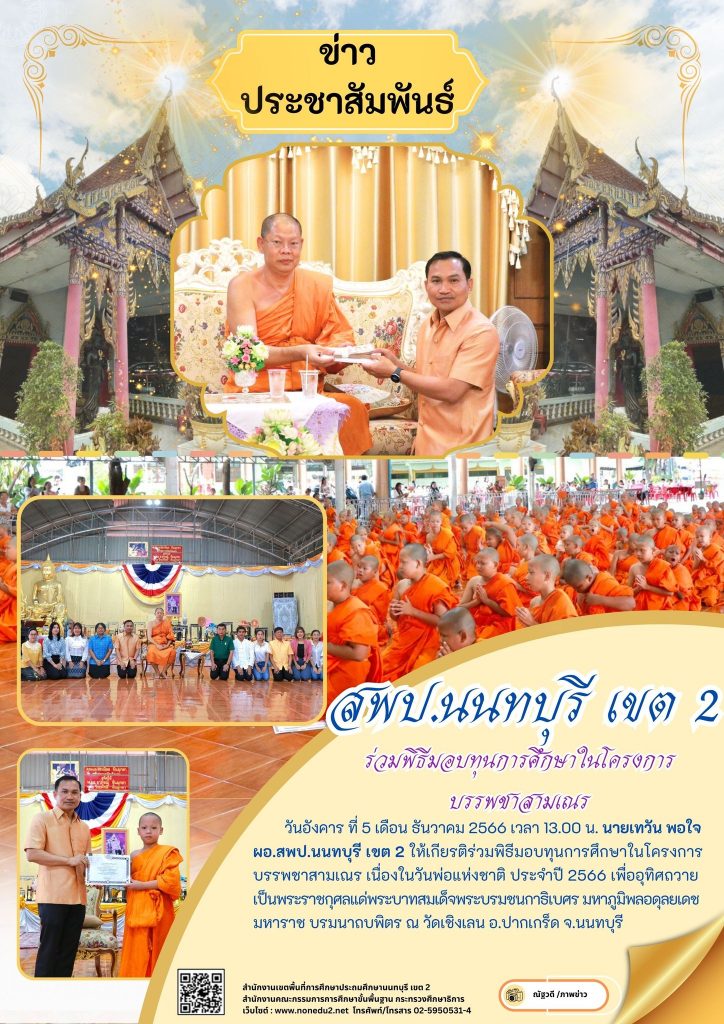 วันอังคาร ที่ 5 เดือน ธันวาคม 2566 เวลา 13.00 น. นายเทวัน พอใจ ผอ.สพป.นนทบุรี เขต 2 ให้เกียรติร่วมพิธีมอบทุนการศึกษาในโครงการบรรพชาสามเณร เนื่องในวันพ่อแห่งชาติ ประจำปี 2566 เพื่ออุทิศถวายเป็นพระราชกุศลแด่พระบาทสมเด็จพระบรมชนกาธิเบศร มหาภูมิพลอดุลยเดชมหาราช บรมนาถบพิตร ณ วัดเชิงเลน อ.ปากเกร็ด จ.นนทบุรี