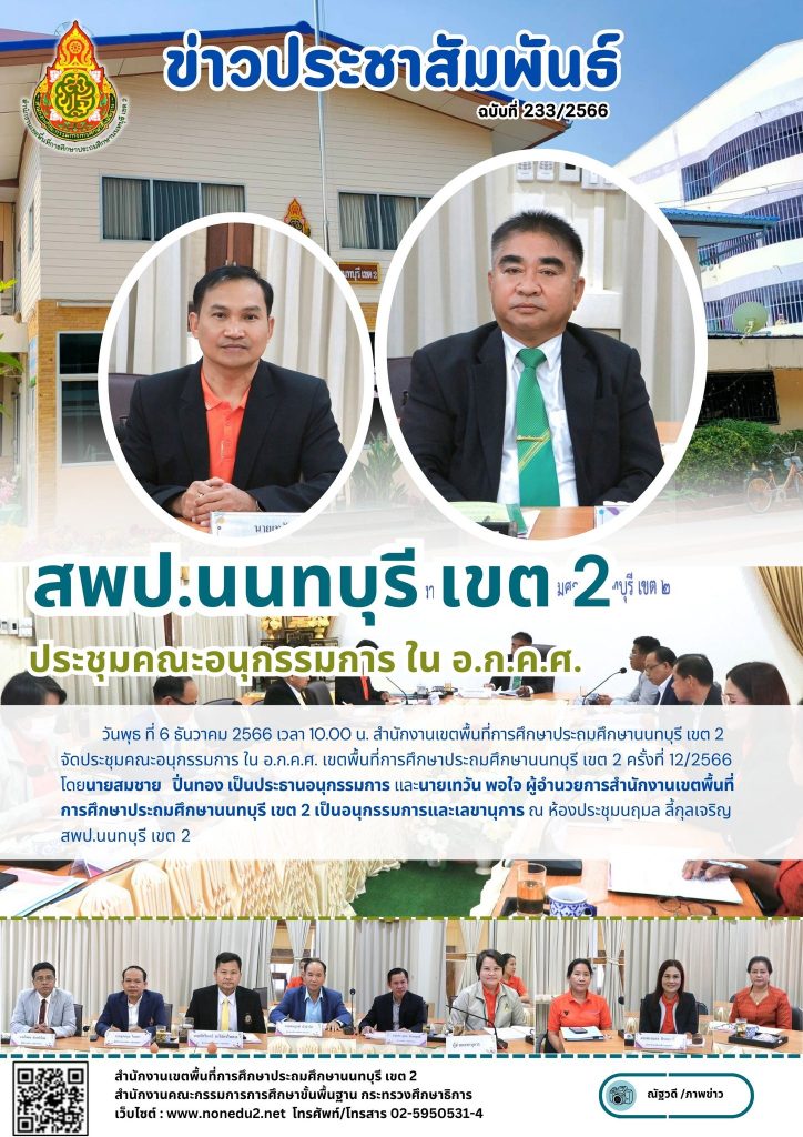 วันพุธ ที่ 6 ธันวาคม 2566 เวลา 10.00 น. สำนักงานเขตพื้นที่การศึกษาประถมศึกษานนทบุรี เขต 2 จัดประชุมคณะอนุกรรมการ ใน อ.ก.ค.ศ. เขตพื้นที่การศึกษาประถมศึกษานนทบุรี เขต 2 ครั้งที่ 12/2566 โดยนายสมชาย ปิ่นทอง เป็นประธานอนุกรรมการ และนายเทวัน พอใจ ผู้อำนวยกาสำนักงานเขตพื้นที่การศึกษาประถมศึกษานนทบุรี เขต 2 เป็นอนุกรรมการและเลขานุการ ณ ห้องประชุมนฤมล ลี้กุลเจริญ สพป.นนทบุรี เขต 2