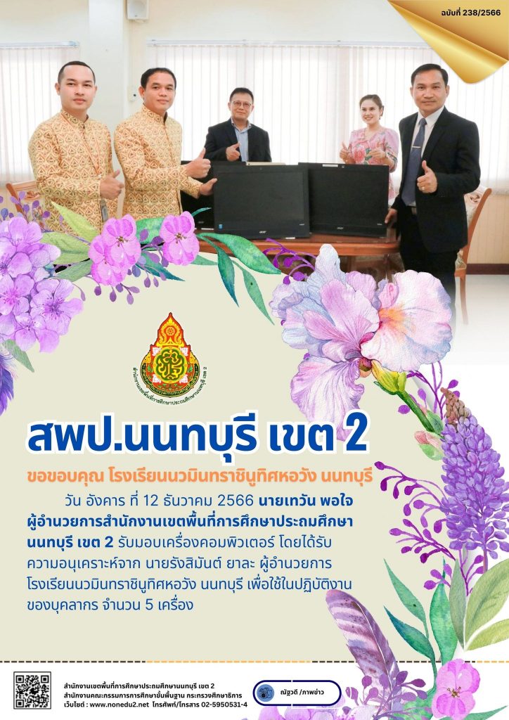 วัน อังคาร ที่ 12 ธันวาคม 2566 นายเทวัน พอใจ ผู้อำนวยการสำนักงานเขตพื้นที่การศึกษาประถมศึกษานนทบุรี เขต 2 รับมอบเครื่องคอมพิวเตอร์ โดยได้รับความอนุเคราะห์จาก นายรังสิมันต์ ยาละ ผู้อำนวยการโรงเรียนนวมินทราชินูทิศหอวัง นนทบุรี เพื่อใช้ในปฏิบัติงานของบุคลากร จำนวน 5 เครื่อง