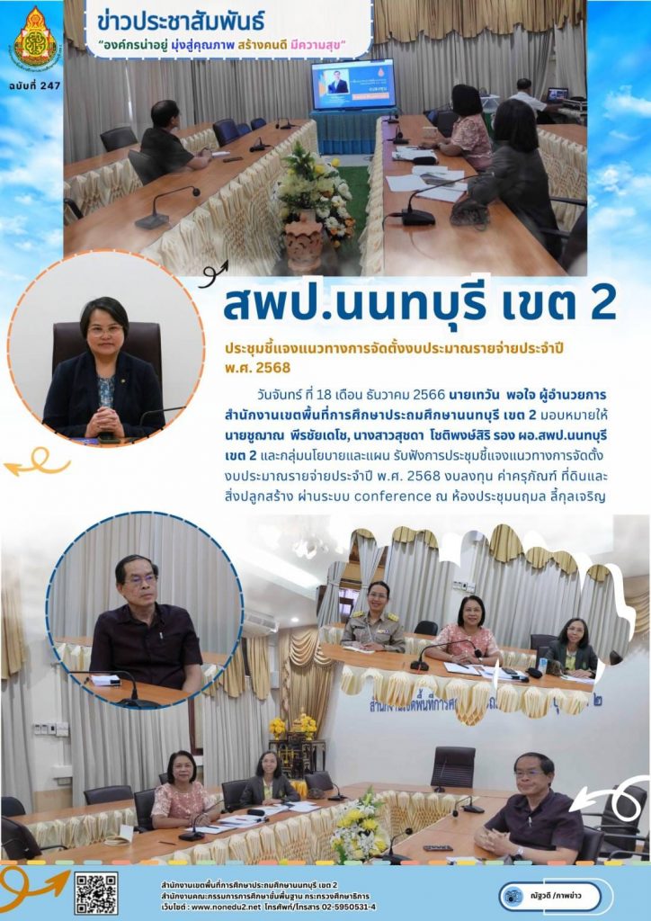 วันจันทร์ ที่ 18 เดือน ธันวาคม 2566 นายเทวัน พอใจ ผู้อำนวยการสำนักงานเขตพื้นที่การศึกษาประถมศึกษานนทบุรี เขต 2 มอบหมายให้ นายชูฌาณ พีรชัยเดโช, นางสาวสุชดา โชติพงษ์สิริ รอง ผอ.สพป.นนทบุรี เขต 2 และกลุ่มนโยบายและแผน รับฟังการประชุมชี้แจงแนวทางการจัดตั้งงบประมาณรายจ่ายประจำปี พ.ศ. 2568 งบลงทุน ค่าครุภัณฑ์ ที่ดินและสิ่งปลูกสร้าง ผ่านระบบ conference ณ ห้องประชุมนฤมล ลี้กุลเจริญ