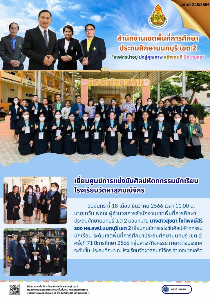 วันจันทร์ ที่ 18 เดือน ธันวาคม 2566 เวลา 11.00 น. นายเทวัน พอใจ ผู้อำนวยการสำนักงานเขตพื้นที่การศึกษาประถมศึกษานนทบุรี เขต 2 มอบหมาย นางสาวสุชดา โชติพงษ์สิริ รอง ผอ.สพป.นนทบุรี เขต 2 เยี่ยมศูนย์การแข่งขันศิลปหัตถกรรมนักเรียน ระดับเขตพื้นที่การศึกษาประถมศึกษานนทบุรี เขต 2 ครั้งที่ 71 ปีการศึกษา 2566 กลุ่มสาระ/กิจกรรม ภาษาต่างประเทศ ระดับชั้น ประถมศึกษา ณ โรงเรียนวัดผาสุกมณีจักร อำเภอปากเกร็ด