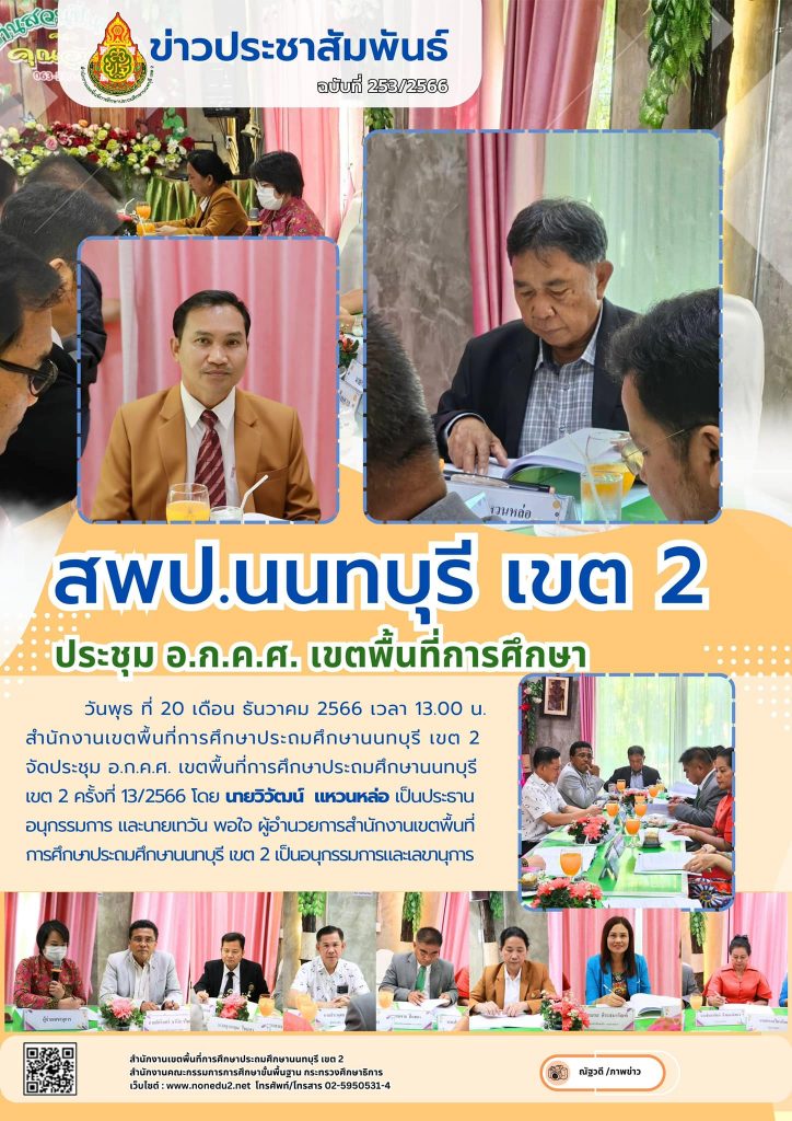 วันพุธ ที่ 20 เดือน ธันวาคม 2566 เวลา 13.00 น. สำนักงานเขตพื้นที่การศึกษาประถมศึกษานนทบุรี เขต 2 จัดประชุม อ.ก.ค.ศ. เขตพื้นที่การศึกษาประถมศึกษานนทบุรี เขต 2 ครั้งที่ 13/2566 โดย นายวิวัฒน์ แหวนหล่อ เป็นประธานอนุกรรมการ และนายเทวัน พอใจ ผู้อำนวยการสำนักงานเขตพื้นที่การศึกษาประถมศึกษานนทบุรี เขต 2 เป็นอนุกรรมการและเลขานุการ