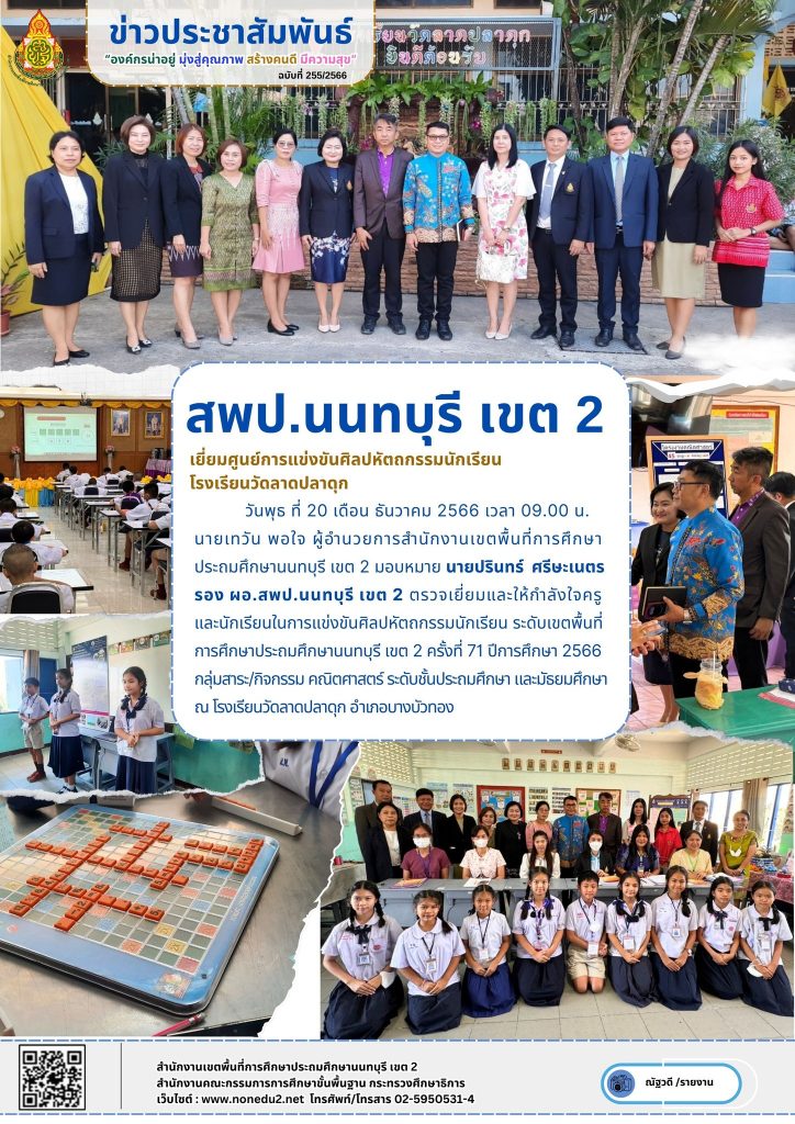 วันพุธ ที่ 20 เดือน ธันวาคม 2566 เวลา 09.00 น. นายเทวัน พอใจ ผู้อำนวยการสำนักงานเขตพื้นที่การศึกษาประถมศึกษานนทบุรี เขต 2 มอบหมาย นายปรินทร์ ศรีษะเนตร รอง ผอ.สพป.นนทบุรี เขต 2 ตรวจเยี่ยมและให้กำลังใจครูและนักเรียนในการแข่งขันศิลปหัตถกรรมนักเรียน ระดับเขตพื้นที่การศึกษาประถมศึกษานนทบุรี เขต 2 ครั้งที่ 71 ปีการศึกษา 2566 กลุ่มสาระ/กิจกรรม คณิตศาสตร์ ระดับชั้นประถมศึกษา และมัธยมศึกษา ณ โรงเรียนวัดลาดปลาดุก อำเภอบางบัวทอง