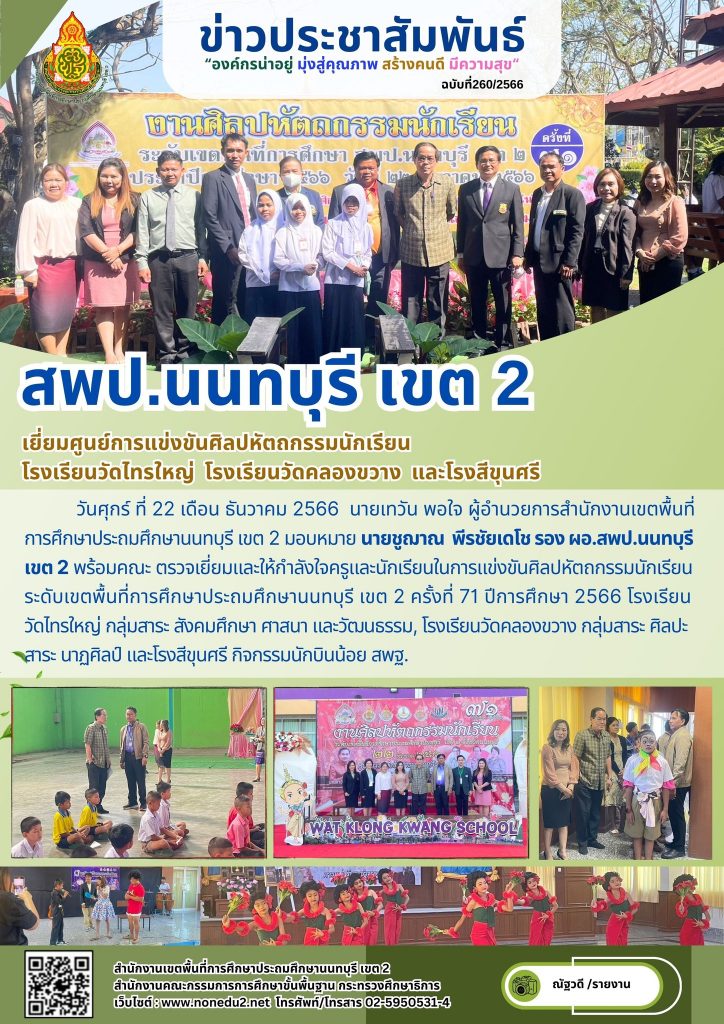 วันศุกร์ ที่ 22 เดือน ธันวาคม 2566 นายเทวัน พอใจ ผู้อำนวยการสำนักงานเขตพื้นที่การศึกษาประถมศึกษานนทบุรี เขต 2 มอบหมาย นายชูฌาณ พีรชัยเดโช รอง ผอ.สพป.นนทบุรี เขต 2 พร้อมคณะ ตรวจเยี่ยมและให้กำลังใจครูและนักเรียนในการแข่งขันศิลปหัตถกรรมนักเรียนระดับเขตพื้นที่การศึกษาประถมศึกษานนทบุรี เขต 2 ครั้งที่ 71 ปีการศึกษา 2566 โรงเรียนวัดไทรใหญ่ กลุ่มสาระ สังคมศึกษา ศาสนา และวัฒนธรรม, โรงเรียนวัดคลองขวาง กลุ่มสาระ ศิลปะ สาระ นาฏศิลป์ และโรงสีขุนศรี กิจกรรมนักบินน้อย สพฐ.