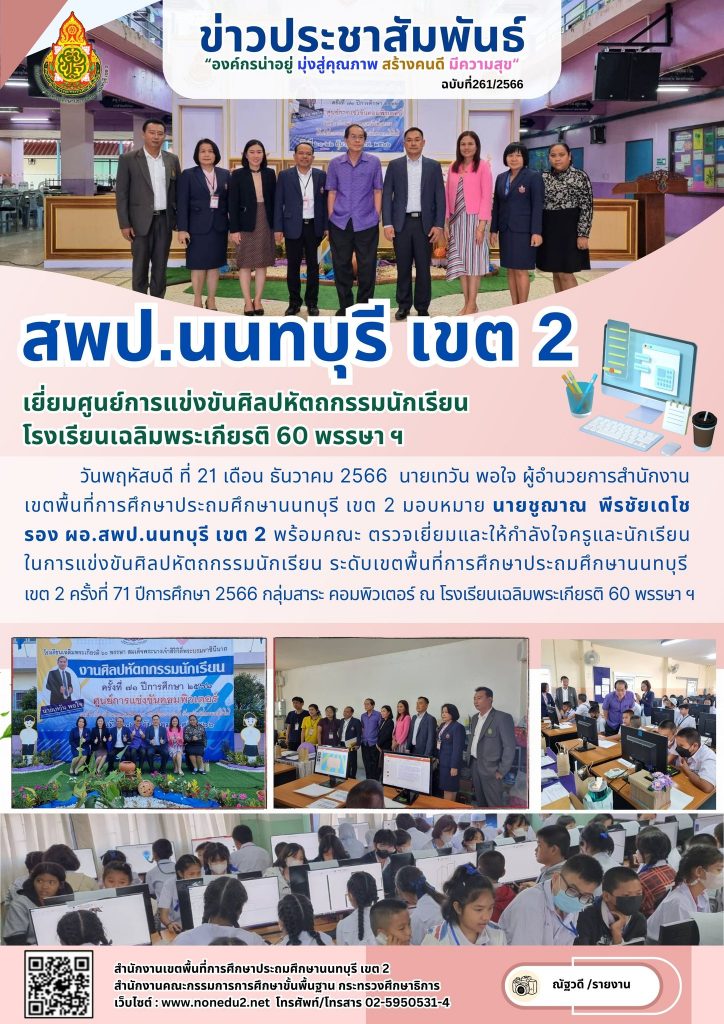 วันพฤหัสบดี ที่ 21 เดือน ธันวาคม 2566 นายเทวัน พอใจ ผู้อำนวยการสำนักงานเขตพื้นที่การศึกษาประถมศึกษานนทบุรี เขต 2 มอบหมาย นายชูฌาณ พีรชัยเดโช รอง ผอ.สพป.นนทบุรี เขต 2 พร้อมคณะ ตรวจเยี่ยมและให้กำลังใจครูและนักเรียนในการแข่งขันศิลปหัตถกรรมนักเรียน ระดับเขตพื้นที่การศึกษาประถมศึกษานนทบุรี เขต 2 ครั้งที่ 71 ปีการศึกษา 2566 กลุ่มสาระ คอมพิวเตอร์ ณ โรงเรียนเฉลิมพระเกียรติ 60 พรรษา ฯ
