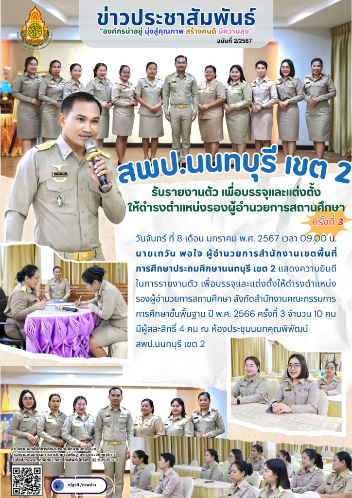 วันจันทร์ ที่ 8 เดือน มกราคม พ.ศ. 2567 เวลา 09.00 น. นายเทวัน พอใจ ผู้อำนวยการสำนักงานเขตพื้นที่การศึกษาประถมศึกษานนทบุรี เขต 2 แสดงความยินดีในการรายงานตัว เพื่อบรรจุและแต่งตั้งให้ดำรงตำแหน่ง รองผู้อำนวยการสถานศึกษา สังกัดสำนักงานคณะกรรมการการศึกษาขั้นพื้นฐาน ปี พ.ศ. 2566 ครั้งที่ 3 จำนวน 10 คน มีผู้สละสิทธิ์ 4 คน ณ ห้องประชุมนนทคุณพิพัฒน์ สพป.นนทบุรี เขต 2