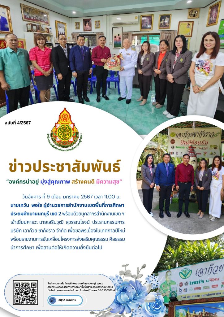 วันอังคาร ที่ 9 เดือน มกราคม 2567 เวลา 11.00 น. นายเทวัน พอใจ ผู้อำนวยการสำนักงานเขตพื้นที่การศึกษาประถมศึกษานนทบุรี เขต 2 พร้อมด้วยบุคลากรสำนักงานเขต ฯ เข้าเยี่ยมคารวะ นายเสริมวุฒิ สุวรรณโรจน์ ประธานกรรมการ บริษัท เฉาก๊วย ชากังราว จำกัด เพื่อขอพรเนื่องในเทศกาลปีใหม่ พร้อมรายงานการขับเคลื่อนโครงการส่งเสริมคุณธรรม ศีลธรรมนำการศึกษา เพื่อสานต่อให้เกิดความยั่งยืนต่อไป