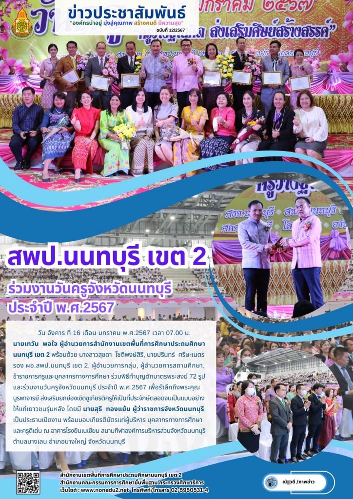 วันอังคาร ที่ 16 เดือน มกราคม พ.ศ.2567 เวลา 07.00 น. นายเทวัน พอใจ ผู้อำนวยการสำนักงานเขตพื้นที่การศึกษาประถมศึกษานนทบุรี เขต 2 พร้อมด้วย นางสาวสุชดา โชติพงษ์สิริ, นายปรินทร์ ศรีษะเนตร รอง ผอ.สพป.นนทบุรี เขต 2, ผู้อำนวยการกลุ่ม, ผู้อำนวยการสถานศึกษา, ข้าราชการครูและบุคลากรทางการศึกษา ร่วมพิธีทำบุญตักบาตรพระสงฆ์ 72 รูป และร่วมงานวันครูจังหวัดนนทบุรี ประจำปี พ.ศ.2567 เพื่อรำลึกถึงพระคุณบูรพาจารย์ ส่งเสริมยกย่องเชิดชูเกียรติครูให้เป็นที่ประจักษ์ตลอดจนเป็นแบบอย่างให้แก่เยาวชนรุ่นหลัง โดยมี นายสุธี ทองแย้ม ผู้ว่าราชการจังหวัดนนทบุรี เป็นประธานเปิดงาน พร้อมมอบเกียรติบัตรแก่ผู้บริหาร บุคลากรทางการศึกษาและครูดีเด่น ณ อาคารโรงยิมเนเซียม สนามกีฬาองค์การบริหารส่วนจังหวัดนนทบุรี ตำบลบางเลน อำเภอบางใหญ่ จังหวัดนนทบุรี