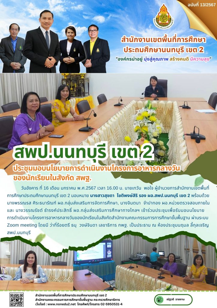 วันอังคาร ที่ 16 เดือน มกราคม พ.ศ.2567 เวลา 16.00 น. นายเทวัน พอใจ ผู้อำนวยการสำนักงานเขตพื้นที่การศึกษาประถมศึกษานนทบุรี เขต 2 มอบหมาย นางสาวสุชดา โชติพงษ์สิริ รอง ผอ.สพป.นนทบุรี เขต 2 พร้อมด้วย นางพรรณรส ศิระธนารัณฑ์ ผอ.กลุ่มส่งเสริมการจัดการศึกษา, นางจินตนา จำปาทอง ผอ.หน่วยตรวจสอบภายใน และ นางวรรณรัชต์ ธำรงค์ประสิทธิ์ ผอ.กลุ่มส่งเสริมการศึกษาทางไกลฯ เข้าร่วมประชุมเพื่อรับมอบนโยบายการดำเนินงานโครงการอาหารกลางวันของนักเรียนในสังกัดสำนักงานคณะกรรมการการศึกษาขั้นพื้นฐาน ผ่านระบบ Zoom meeting โดยมี ว่าที่ร้อยตรี ธนุ วงษ์จินดา เลขาธิการ กพฐ. เป็นประธาน ณ ห้องประชุมนฤมล ลี้กุลเจริญ สพป.นนทบุรี