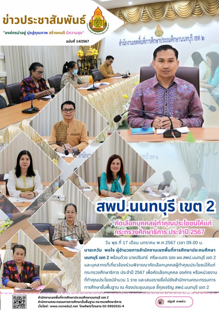 วัน พุธ ที่ 17 เดือน มกราคม พ.ศ.2567 เวลา 09.00 น. นายเทวัน พอใจ ผู้อำนวยการสำนักงานเขตพื้นที่การศึกษาประถมศึกษานนทบุรี เขต 2 พร้อมด้วย นายปรินทร์ ศรีษะเนตร รอง ผอ.สพป.นนทบุรี เขต 2 และบุคลากรที่เกี่ยวข้องร่วมพิจารณาคัดเลือกบุคคลผู้ทำคุณประโยชน์ให้แก่กระทรวงศึกษาธิการ ประจำปี 2567 เพื่อคัดเลือกบุคคล องค์กร หรือหน่วยงานที่ทำคุณประโยชน์จำนวน 1 ราย และเสนอรายชื่อไปยังสำนักงานคณะกรรมการการศึกษาขั้นพื้นฐาน ณ ห้องประชุมนฤมล ลี้กุลเจริญ สพป.นนทบุรี เขต 2