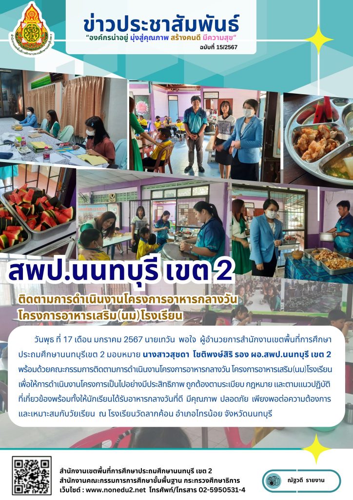 วันพุธ ที่ 17 เดือน มกราคม 2567 นายเทวัน พอใจ ผู้อำนวยการสำนักงานเขตพื้นที่การศึกษาประถมศึกษานนทบุรีเขต 2 มอบหมาย นางสาวสุชดา โชติพงษ์สิริ รอง ผอ.สพป.นนทบุรี เขต 2 พร้อมด้วยคณะกรรมการติดตามการดำเนินงานโครงการอาหารกลางวัน โครงการอาหารเสริม(นม)โรงเรียน เพื่อให้การดำเนินงานโครงการเป็นไปอย่างมีประสิทธิภาพ ถูกต้องตามระเบียบ กฎหมาย และตามแนวปฏิบัติที่เกี่ยวข้องพร้อมทั้งให้นักเรียนได้รับอาหารกลางวันที่ดี มีคุณภาพ ปลอดภัย เพียงพอต่อความต้องการ และเหมาะสมกับวัยเรียน ณ โรงเรียนวัดลากค้อน อำเภอไทรน้อย จังหวัดนนทบุรี
