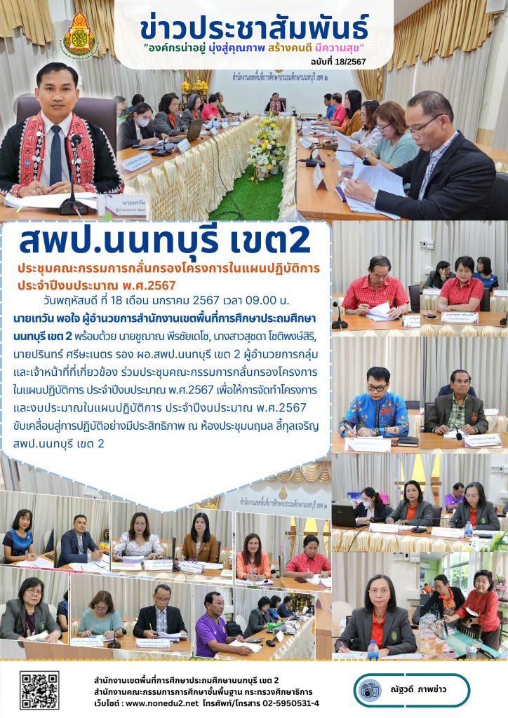 วันพฤหัสบดี ที่ 18 เดือน มกราคม 2567 เวลา 09.00 น. นายเทวัน พอใจ ผู้อำนวยการสำนักงานเขตพื้นที่การศึกษาประถมศึกษานนทบุรี เขต 2 พร้อมด้วย นายชูฌาณ พีรชัยเดโช, นางสาวสุชดา โชติพงษ์สิริ, นายปรินทร์ ศรีษะเนตร รอง ผอ.สพป.นนทบุรี เขต 2 ผู้อำนวยการกลุ่ม และเจ้าหน้าที่ที่เกี่ยวข้อง ร่วมประชุมคณะกรรมการกลั่นกรองโครงการในแผนปฏิบัติการ ประจำปีงบประมาณ พ.ศ.2567 เพื่อให้การจัดทำโครงการและงบประมาณในแผนปฏิบัติการ ประจำปีงบประมาณ พ.ศ.2567 ขับเคลื่อนสู่การปฏิบัติอย่างมีประสิทธิภาพ ณ ห้องประชุมนฤมล ลี้กุลเจริญ สพป.นนทบุรี เขต 2