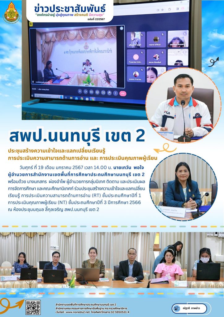 วันศุกร์ ที่ 19 เดือน มกราคม 2567 เวลา 14.00 น. นายเทวัน พอใจ ผู้อำนวยการสำนักงานเขตพื้นที่การศึกษาประถมศึกษานนทบุรี เขต 2 พร้อมด้วย นางนภสกร ผ่องอำไพ ผู้อำนวยการกลุ่มนิเทศ ติดตาม และประเมินผลการจัดการศึกษา และคณะศึกษานิเทศก์ ร่วมประชุมสร้างความเข้าใจและแลกเปลี่ยนเรียนรู้ การประเมินความสามารถด้านการอ่าน (RT) ชั้นประถมศึกษาปีที่ 1 การประเมินคุณภาพผู้เรียน (NT) ชั้นประถมศึกษาปีที่ 3 ปีการศึกษา 2566 ณ ห้องประชุมนฤมล ลี้กุลเจริญ สพป.นนทบุรี เขต 2