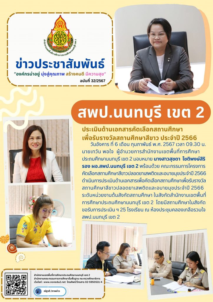 วันอังคาร ที่ 6 เดือน กุมภาพันธ์ พ.ศ. 2567 เวลา 09.30 น. นายเทวัน พอใจ ผู้อำนวยการสำนักงานเขตพื้นที่การศึกษาประถมศึกษานนทบุรี เขต 2 มอบหมาย นางสาวสุชดา โชติพงษ์สิริ รอง ผอ.สพป.นนทบุรี เขต 2 พร้อมด้วย คณะกรรมการโครงการคัดเลือกสถานศึกษาสีขาวปลอดยาเสพติดและอบายมุขประจำปี 2566 ดำเนินการประเมินด้านเอกสารเพื่อคัดเลือกสถานศึกษาเพื่อรับรางวัลสถานศึกษาสีขาวปลอดยาเสพติดและอบายมุขประจำปี 2566 ระดับหน่วยงานต้นสังกัดสถานศึกษา ในสังกัดสำนักงานเขตพื้นที่การศึกษาประถมศึกษานนทบุรี เขต 2 โดยมีสถานศึกษาในสังกัดขอรับการประเมิน ฯ 25 โรงเรียน ณ ห้องประชุมคลองเกลือรวมใจ สพป.นนทบุรี เขต 2