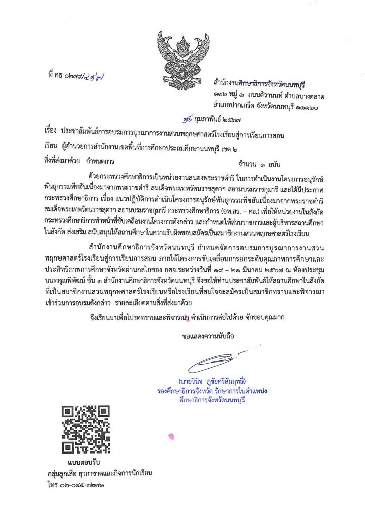 สำนักงานศึกษาธิการจังหวัดนนทบุรี กำหนดจัดการอบรมการบูรณาการงานสวนพฤกษศาสตร์โรงเรียนสู่การสอน ภายใต้โครงการขับเคลื่อนการยกระดับคุณภาพการศึกษาและประสิทธิภาพการศึกษาจังหวัดผ่านกลไกของ กศจ.ระหว่างวันที่ 19-21 มีนาคม 2567 ณ ห้องประชุมนนทคุณพิพัฒน์ ชั้น 3 สำนักศึกษาธิการจังหวัดนนทบุรี จึงขอประชาสัมพันธ์สถานศึกษาที่เป็นสมาชิกงานสวนพฤกษศาสตร์โรงเรียนหรือโรงเรียนที่สนใจจะสมัครเป็นสมาชิก เข้าร่วมอบรมดังกล่าว รายละเอียดตามสิ่งที่ส่งมาด้วย
