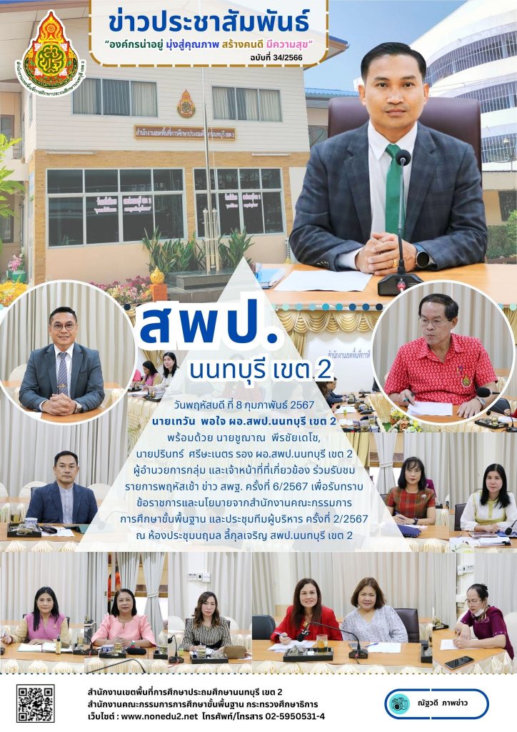 วันพฤหัสบดี ที่ 8 กุมภาพันธ์ 2567 นายเทวัน พอใจ ผอ.สพป.นนทบุรี เขต 2 พร้อมด้วย นายชูฌาณ พีรชัยเดโช, นายปรินทร์ ศรีษะเนตร รอง ผอ.สพป.นนทบุรี เขต 2 ผู้อำนวยการกลุ่ม และเจ้าหน้าที่ที่เกี่ยวข้อง ร่วมรับชมรายการพฤหัสเช้า ข่าว สพฐ. ครั้งที่ 6/2567 เพื่อรับทราบข้อราชการและนโยบายจากสำนักงานคณะกรรมการการศึกษาขั้นพื้นฐาน และประชุมทีมผู้บริหาร ครั้งที่ 2/2567 ณ ห้องประชุมนฤมล ลี้กุลเจริญ สพป.นนทบุรี เขต 2