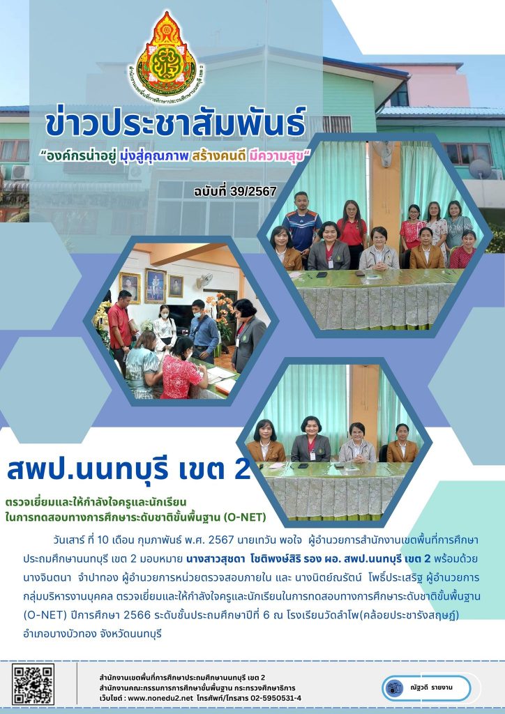 วันเสาร์ ที่ 10 เดือน กุมภาพันธ์ พ.ศ. 2567 นายเทวัน พอใจ ผู้อำนวยการสำนักงานเขตพื้นที่การศึกษาประถมศึกษานนทบุรี เขต 2 มอบหมาย นางสาวสุชดา โชติพงษ์สิริ รอง ผอ. สพป.นนทบุรี เขต 2 พร้อมด้วย นางจินตนา จำปาทอง ผู้อำนวยการหน่วยตรวจสอบภายใน และ นางนิตย์ณรัตน์ โพธิ์ประเสริฐ ผู้อำนวยการกลุ่มบริหารงานบุคคล ตรวจเยี่ยมและให้กำลังใจครูและนักเรียนในการทดสอบทางการศึกษาระดับชาติขั้นพื้นฐาน (O-NET) ปีการศึกษา 2566 ระดับชั้นประถมศึกษาปีที่ 6 ณ โรงเรียนวัดลำโพ(คล้อยประชารังสฤษฏ์) อำเภอบางบัวทอง จังหวัดนนทบุรี