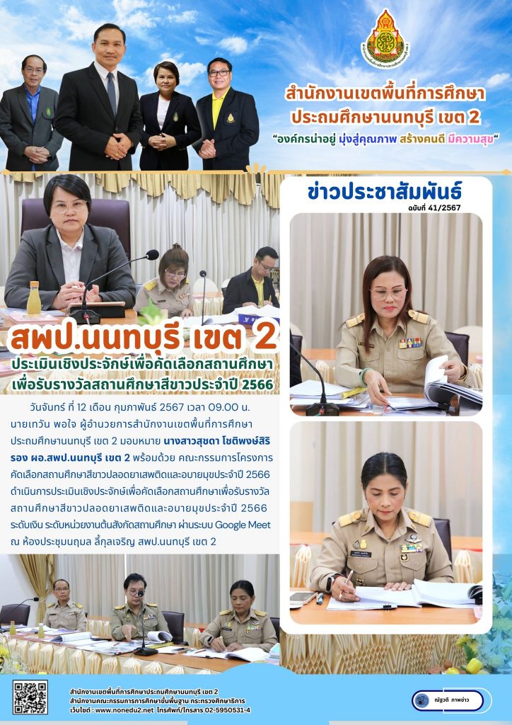 วันจันทร์ ที่ 12 เดือน กุมภาพันธ์ 2567 เวลา 09.00 น. นายเทวัน พอใจ ผู้อำนวยการสำนักงานเขตพื้นที่การศึกษาประถมศึกษานนทบุรี เขต 2 มอบหมาย นางสาวสุชดา โชติพงษ์สิริ รอง ผอ.สพป.นนทบุรี เขต 2 พร้อมด้วย คณะกรรมการโครงการคัดเลือกสถานศึกษาสีขาวปลอดยาเสพติดและอบายมุขประจำปี 2566 ดำเนินการประเมินเชิงประจักษ์เพื่อคัดเลือกสถานศึกษาเพื่อรับรางวัลสถานศึกษาสีขาวปลอดยาเสพติดและอบายมุขประจำปี 2566 ระดับเงิน ระดับหน่วยงานต้นสังกัดสถานศึกษา ผ่านระบบ Google Meet ณ ห้องประชุมนฤมล ลี้กุลเจริญ สพป.นนทบุรี เขต 2