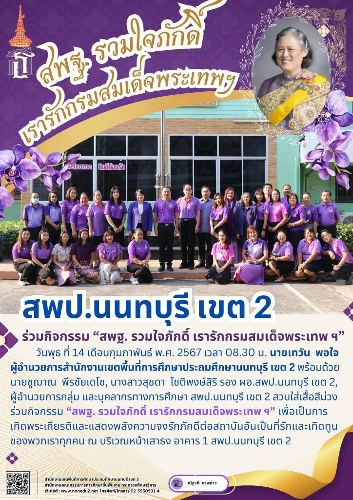 วันพุธ ที่ 14 เดือนกุมภาพันธ์ พ.ศ. 2567 เวลา 08.30 น. นายเทวัน พอใจ ผู้อำนวยการสำนักงานเขตพื้นที่การศึกษาประถมศึกษานนทบุรี เขต 2 พร้อมด้วย นายชูฌาณ พีรชัยเดโช, นางสาวสุชดา โชติพงษ์สิริ รอง ผอ.สพป.นนทบุรี เขต 2, ผู้อำนวยการกลุ่ม และบุคลากรทางการศึกษา สพป.นนทบุรี เขต 2 สวมใส่เสื้อสีม่วง ร่วมกิจกรรม “สพฐ. รวมใจภักดิ์ เรารักกรมสมเด็จพระเทพ ฯ” เพื่อเป็นการเทิดพระเกียรติและแสดงพลังความจงรักภักดีต่อสถาบันอันเป็นที่รักและเทิดทูนของพวกเราทุกคน ณ บริเวณหน้าเสาธง อาคาร 1 สพป.นนทบุรี เขต 2