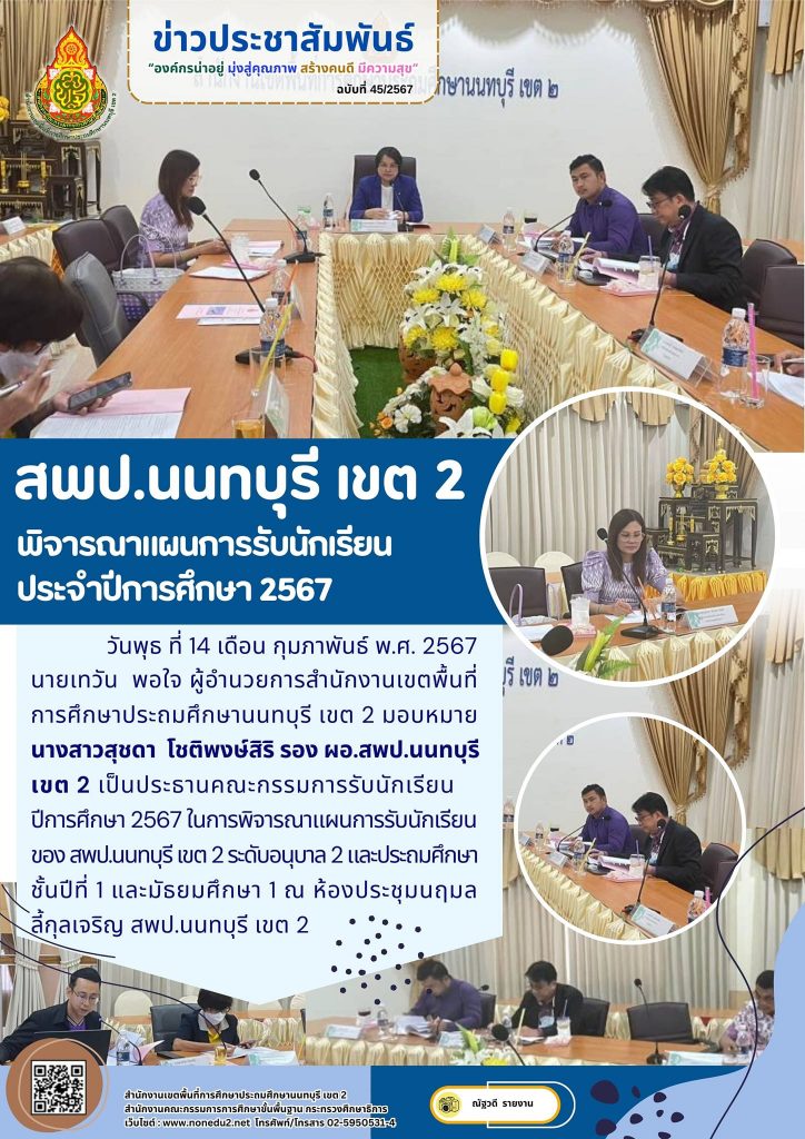วันพุธ ที่ 14 เดือน กุมภาพันธ์ พ.ศ. 2567 นายเทวัน พอใจ ผู้อำนวยการสำนักงานเขตพื้นที่การศึกษาประถมศึกษานนทบุรี เขต 2 มอบหมาย นางสาวสุชดา โชติพงษ์สิริ รอง ผอ.สพป.นนทบุรี เขต 2 เป็นประธานคณะกรรมการรับนักเรียน ปีการศึกษา 2567 ในการพิจารณาแผนการรับนักเรียนของ สพป.นนทบุรี เขต 2 ระดับอนุบาล 2 และประถมศึกษาชั้นปีที่ 1 และมัธยมศึกษา 1 ณ ห้องประชุมนฤมล ลี้กุลเจริญ สพป.นนทบุรี เขต 2
