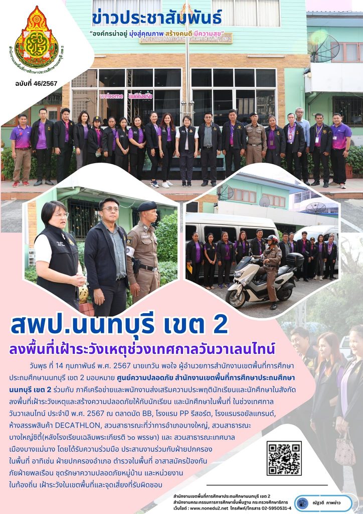 วันพุธ ที่ 14 กุมภาพันธ์ พ.ศ. 2567 นายเทวัน พอใจ ผู้อำนวยการสำนักงานเขตพื้นที่การศึกษาประถมศึกษานนทบุรี เขต 2 มอบหมาย ศูนย์ความปลอดภัยสำนักงานเขตพื้นที่การศึกษาประถมศึกษานนทบุรี เขต 2 ร่วมกับ ภาคีเครือข่ายและพนักงานส่งเสริมความประพฤตินักเรียนและนักศึกษาในสังกัดลงพื้นที่เฝ้าระวังเหตุและสร้างความปลอดภัยให้กับนักเรียน และนักศึกษาในพื้นที่ ในช่วงเทศกาลวันวาเลนไทน์ ประจำปี พ.ศ. 2567 ณ ตลาดนัด BB, โรงแรม PP รีสอร์ต, โรงแรมรอยัลแกรนด์, ห้างสรรพสินค้า DECATHLON, สวนสาธารณะที่ว่าการอำเภอบางใหญ่, สวนสาธารณะบางใหญ่ซิตี้(หลังโรงเรียนเฉลิมพระเกียรติ ๖๐ พรรษา) และ สวนสาธารณะเทศบาลเมืองบางแม่นาง โดยได้รับความร่วมมือ ประสานงานร่วมกับฝ่ายปกครองในพื้นที่ อาทิเช่น ฝ่ายปกครองอำเภอ ตำรวจในพื้นที่ อาสาสมัครป้องกันภัยฝ่ายพลเรือน ชุดรักษาความปลอดภัยหมู่บ้าน และหน่วยงานในท้องถิ่น เฝ้าระวังในเขตพื้นที่และจุดเสี่ยงที่รับผิดชอบ