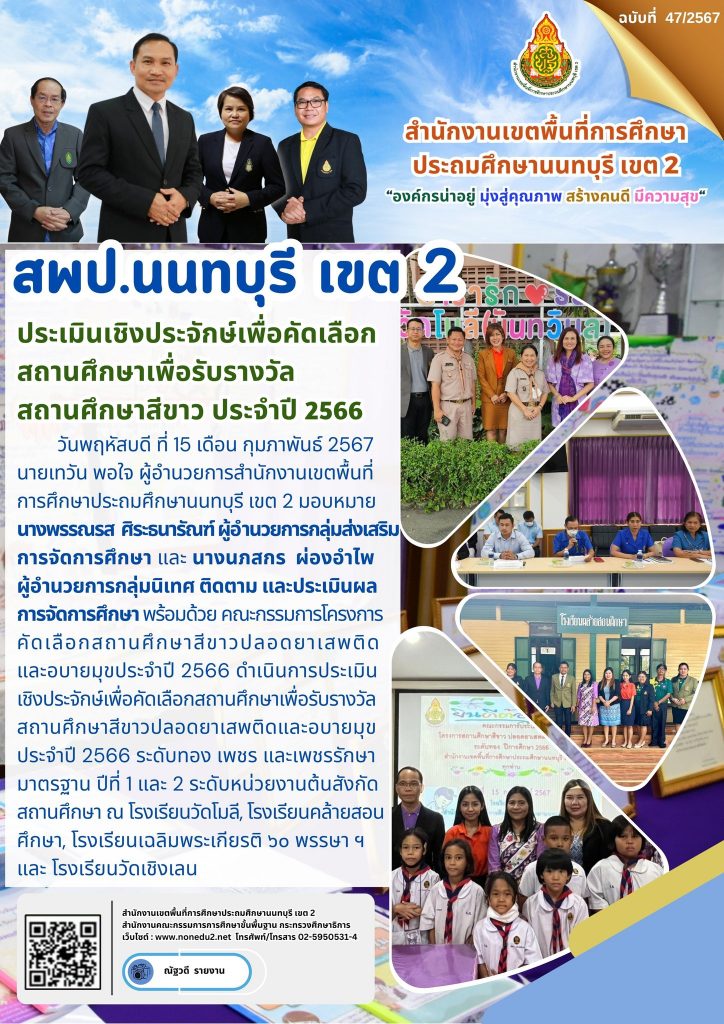 วันพฤหัสบดี ที่ 15 เดือน กุมภาพันธ์ 2567 นายเทวัน พอใจ ผู้อำนวยการสำนักงานเขตพื้นที่การศึกษาประถมศึกษานนทบุรี เขต 2 มอบหมาย นางพรรณรส ศิระธนารัณฑ์ ผู้อำนวยการกลุ่มส่งเสริมการจัดการศึกษา และ นางนภสกร ผ่องอำไพ ผู้อำนวยการกลุ่มนิเทศ ติดตาม และประเมินผลการจัดการศึกษา พร้อมด้วย คณะกรรมการโครงการคัดเลือกสถานศึกษาสีขาวปลอดยาเสพติดและอบายมุขประจำปี 2566 ดำเนินการประเมินเชิงประจักษ์เพื่อคัดเลือกสถานศึกษาเพื่อรับรางวัลสถานศึกษาสีขาวปลอดยาเสพติดและอบายมุขประจำปี 2566 ระดับทอง เพชร และเพชรรักษามาตรฐาน ปีที่ 1 และ 2 ระดับหน่วยงานต้นสังกัดสถานศึกษา ณ โรงเรียนวัดโมลี, โรงเรียนคล้ายสอนศึกษา, โรงเรียนเฉลิมพระเกียรติ ๖๐ พรรษา ฯ และ โรงเรียนวัดเชิงเลน