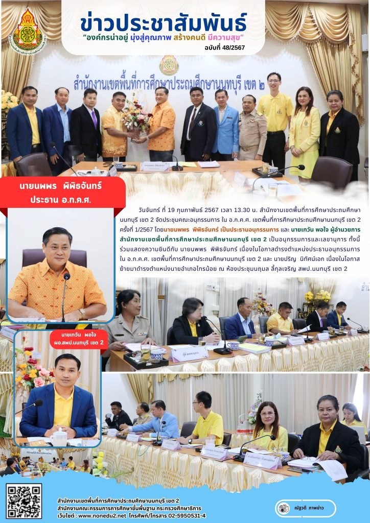 วันจันทร์ ที่ 19 กุมภาพันธ์ 2567 เวลา 13.30 น. สำนักงานเขตพื้นที่การศึกษาประถมศึกษานนทบุรี เขต 2 จัดประชุมคณะอนุกรรมการ ใน อ.ก.ค.ศ. เขตพื้นที่การศึกษาประถมศึกษานนทบุรี เขต 2 ครั้งที่ 1/2567 โดยนายนพพร พิพิธจันทร์ เป็นประธานอนุกรรมการ และ นายเทวัน พอใจ ผู้อำนวยการสำนักงานเขตพื้นที่การศึกษาประถมศึกษานนทบุรี เขต 2 เป็นอนุกรรมการและเลขานุการ ทั้งนี้ ร่วมแสดงความยินดีกับ นายนพพร พิพิธจันทร์ เนื่องในโอกาสดำรงตำแหน่งประธานอนุกรรมการ ใน อ.ก.ค.ศ. เขตพื้นที่การศึกษาประถมศึกษานนทบุรี เขต 2 และ นายปริญ นิทัศน์เอก เนื่องในโอกาสย้ายมาดำรงตำแหน่งนายอำเภอไทรน้อย ณ ห้องประชุมนฤมล ลี้กุลเจริญ สพป.นนทบุรี เขต 2
