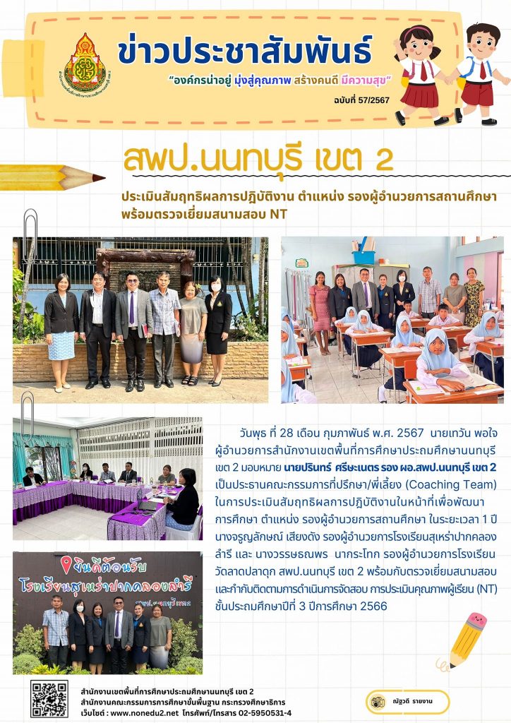 วันพุธ ที่ 28 เดือน กุมภาพันธ์ พ.ศ. 2567 นายเทวัน พอใจ ผู้อำนวยการสำนักงานเขตพื้นที่การศึกษาประถมศึกษานนทบุรี เขต 2 มอบหมาย นายปรินทร์ ศรีษะเนตร รอง ผอ.สพป.นนทบุรี เขต 2 เป็นประธานคณะกรรมการที่ปรึกษา/พี่เลี้ยง (Coaching Team) ในการประเมินสัมฤทธิผลการปฎิบัติงานในหน้าที่เพื่อพัฒนาการศึกษา ตำแหน่ง รองผู้อำนวยการสถานศึกษา ในระยะเวลา 1 ปี นางจรูญลักษณ์ เสียงดัง รองผู้อำนวยการโรงเรียนสุเหร่าปากคลองลำรี และ นางวรรษธณพร นากระโทก รองผู้อำนวยการโรงเรียนวัดลาดปลาดุก สพป.นนทบุรี เขต 2 พร้อมกับตรวจเยี่ยมสนามสอบ และกำกับติดตามการดำเนินการจัดสอบ การประเมินคุณภาพผู้เรียน (NT) ชั้นประถมศึกษาปีที่ 3 ปีการศึกษา 2566