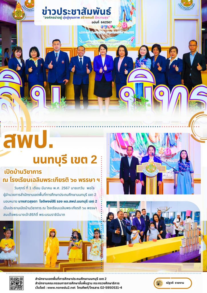 วันศุกร์ ที่ 1 เดือน มีนาคม พ.ศ. 2567 นายเทวัน พอใจ ผู้อำนวยการสำนักงานเขตพื้นที่การศึกษาประถมศึกษานนทบุรี เขต 2 มอบหมาย นางสาวสุชดา โชติพงษ์สิริ รอง ผอ.สพป.นนทบุรี เขต 2 เป็นประธานเปิดบ้านวิชาการ ณ โรงเรียนเฉลิมพระเกียรติ ๖๐ พรรษา สมเด็จพระนางเจ้าสิริกิติ์ พระบรมราชินีนาถ