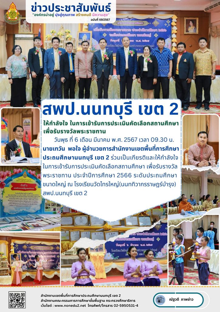 วันพุธ ที่ 6 เดือน มีนาคม พ.ศ. 2567 เวลา 09.30 น. นายเทวัน พอใจ ผู้อำนวยการสำนักงานเขตพื้นที่การศึกษาประถมศึกษานนทบุรี เขต 2 ร่วมเป็นเกียรติและให้กำลังใจ ในการเข้ารับการประเมินคัดเลือกสถานศึกษา เพื่อรับรางวัลพระราชทาน ประจำปีการศึกษา 2566 ระดับประถมศึกษา ขนาดใหญ่ ณ โรงเรียนวัดไทรใหญ่(นนททิวากรราษฎร์บำรุง) สพป.นนทบุรี เขต 2
