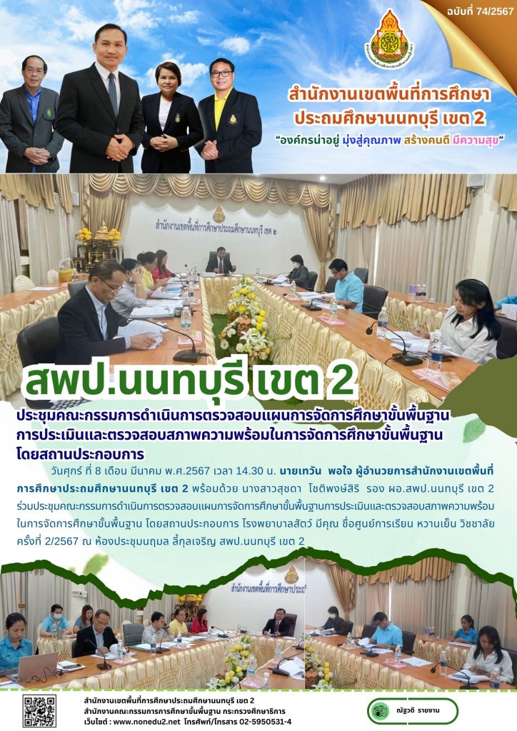 วันศุกร์ ที่ 8 เดือน มีนาคม พ.ศ.2567 เวลา 14.30 น. นายเทวัน พอใจ ผู้อำนวยการสำนักงานเขตพื้นที่การศึกษาประถมศึกษานนทบุรี เขต 2 พร้อมด้วย นางสาวสุชดา โชติพงษ์สิริ รอง ผอ.สพป.นนทบุรี เขต 2 ร่วมประชุมคณะกรรมการดำเนินการตรวจสอบแผนการจัดการศึกษาขั้นพื้นฐานการประเมินและตรวจสอบสภาพความพร้อมในการจัดการศึกษาขั้นพื้นฐาน โดยสถานประกอบการ โรงพยาบาลสัตว์ มีคุณ ชื่อศูนย์การเรียน หวานเย็น วิชชาลัย ครั้งที่ 2/2567 ณ ห้องประชุมนฤมล ลี้กุลเจริญ สพป.นนทบุรี เขต 2