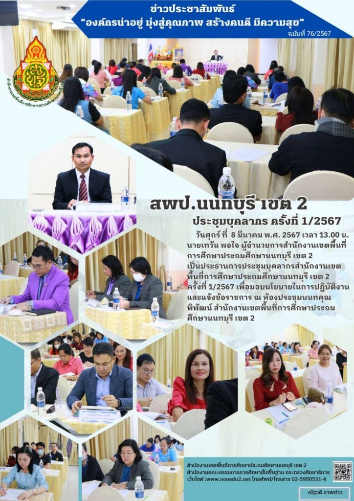 วันศุกร์ ที่ 8 มีนาคม พ.ศ. 2567 เวลา 13.00 น. นายเทวัน พอใจ ผู้อำนวยการสำนักงานเขตพื้นที่การศึกษาประถมศึกษานนทบุรี เขต 2 เป็นประธานการประชุมบุคลากรสำนักงานเขตพื้นที่การศึกษาประถมศึกษานนทบุรี เขต 2 ครั้งที่ 1/2567 เพื่อมอบนโยบายในการปฏิบัติงานและแจ้งข้อราชการ ณ ห้องประชุมนนทคุณพิพัฒน์ สำนักงานเขตพื้นที่การศึกษาประถมศึกษานนทบุรี เขต 2