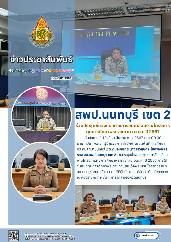 วันอังคาร ที่ 12 เดือน มีนาคม พ.ศ. 2567 เวลา 09.30 น. นายเทวัน พอใจ ผู้อำนวยการสำนักงานเขตพื้นที่การศึกษาประถมศึกษานนทบุรี เขต 2 มอบหมาย นางสาวสุชดา โชติพงษ์สิริ รอง ผอ.สพป.นนทบุร เขต 2 ร่วมประชุมชี้แจงแนวทางการขับเคลื่อนงานโครงการทุนการศึกษาพระราชทาน ม.ท.ศ. ปี 2567 ภายใต้ “มูลนิธิทุนการศึกษาพระราชทานสมเด็จพระบรมโอรสาธิราช ฯ สยามมกุฎราชกุมาร” ผ่านระบบวีดิทัศน์ทางไกล (Video Conference) ณ ห้องราชพฤกษ์ ชั้น 4 ศาลากลางจังหวัดนนทบุรี