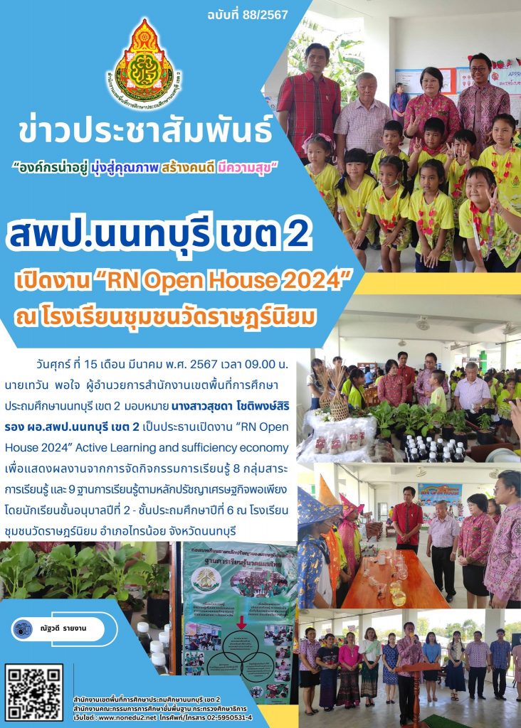 วันศุกร์ ที่ 15 เดือน มีนาคม พ.ศ. 2567 เวลา 09.00 น. นายเทวัน พอใจ ผู้อำนวยการสำนักงานเขตพื้นที่การศึกษาประถมศึกษานนทบุรี เขต 2 มอบหมาย นางสาวสุชดา โชติพงษ์สิริ รอง ผอ.สพป.นนทบุรี เขต 2 เป็นประธานเปิดงาน “RN Open House 2024” Active Learning and sufficiency economy เพื่อแสดงผลงานจากการจัดกิจกรรมการเรียนรู้ 8 กลุ่มสาระการเรียนรู้ และ 9 ฐานการเรียนรู้ตามหลักปรัชญาเศรษฐกิจพอเพียง โดยนักเรียนชั้นอนุบาลปีที่ 2 – ชั้นประถมศึกษาปีที่ 6 ณ โรงเรียนชุมชนวัดราษฎร์นิยม อำเภอไทรน้อย จังหวัดนนทบุรี