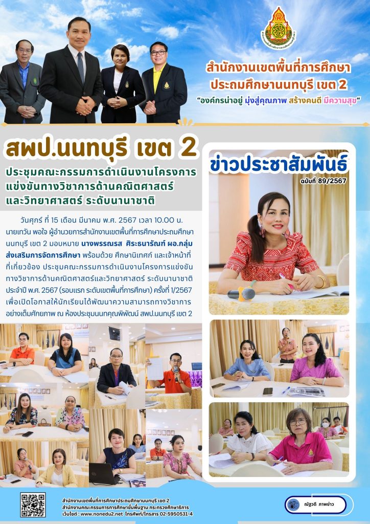 วันศุกร์ ที่ 15 เดือน มีนาคม พ.ศ. 2567 เวลา 10.00 น. นายเทวัน พอใจ ผู้อำนวยการสำนักงานเขตพื้นที่การศึกษาประถมศึกษานนทบุรี เขต 2 มอบหมาย นางพรรณรส ศิระธนารัณฑ์ ผอ.กลุ่มส่งเสริมการจัดการศึกษา พร้อมด้วย ศึกษานิเทศก์ และเจ้าหน้าที่ที่เกี่ยวข้อง ประชุมคณะกรรมการดำเนินงานโครงการแข่งขันทางวิชาการด้านคณิตศาสตร์และวิทยาศาสตร์ ระดับนานาชาติ ประจำปี พ.ศ. 2567 (รอบแรก ระดับเขตพื้นที่การศึกษา) ครั้งที่ 1/2567 เพื่อเปิดโอกาสให้นักเรียนได้พัฒนาความสามารถทางวิชาการอย่างเต็มศักยภาพ ณ ห้องประชุมนนทคุณพิพัฒน์ สพป.นนทบุรี เขต 2
