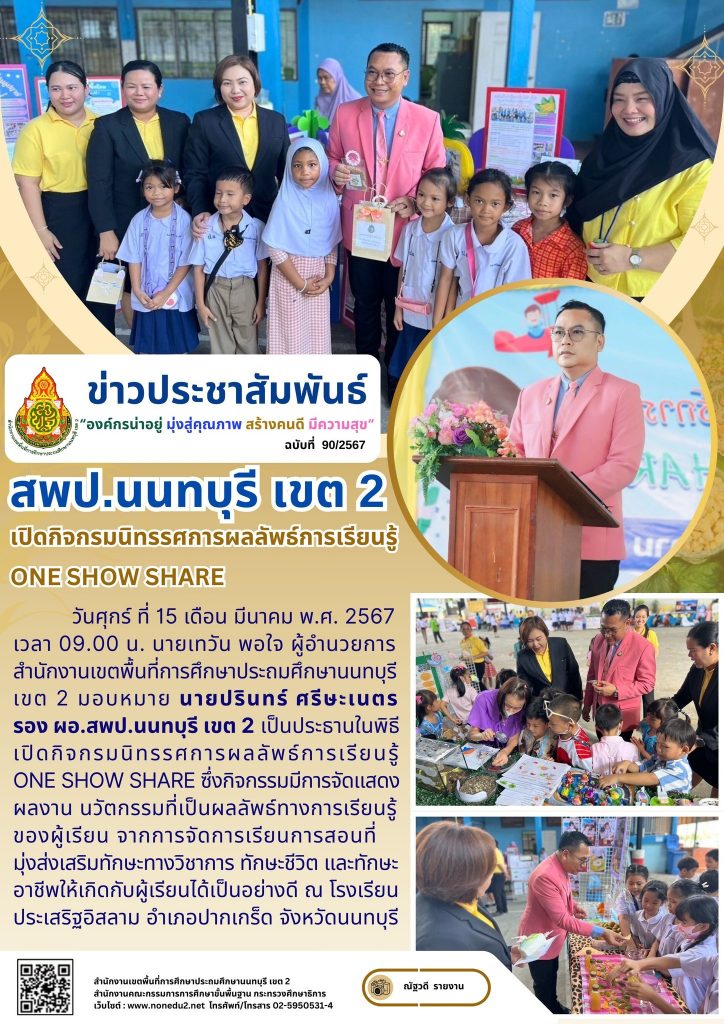 วันศุกร์ ที่ 15 เดือน มีนาคม พ.ศ. 2567 เวลา 09.00 น. นายเทวัน พอใจ ผู้อำนวยการสำนักงานเขตพื้นที่การศึกษาประถมศึกษานนทบุรี เขต 2 มอบหมาย นายปรินทร์ ศรีษะเนตร รอง ผอ.สพป.นนทบุรี เขต 2 เป็นประธานในพิธีเปิดกิจกรมนิทรรศการผลลัพธ์การเรียนรู้ ONE SHOW SHARE ซึ่งกิจกรรมมีการจัดแสดงผลงาน นวัตกรรมที่เป็นผลลัพธ์ทางการเรียนรู้ของผู้เรียน จากการจัดการเรียนการสอนที่มุ่งส่งเสริมทักษะทางวิชาการ ทักษะชีวิต และทักษะอาชีพให้เกิดกับผู้เรียนได้เป็นอย่างดี ณ โรงเรียนประเสริฐอิสลาม อำเภอปากเกร็ด จังหวัดนนทบุรี