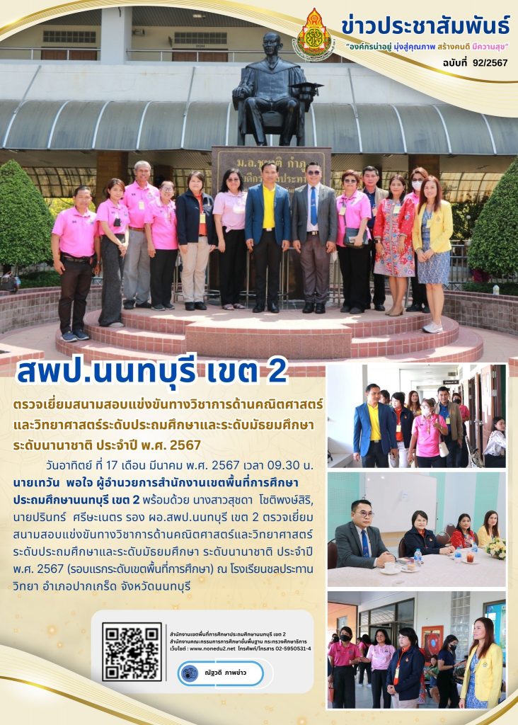 วันอาทิตย์ ที่ 17 เดือน มีนาคม พ.ศ. 2567 เวลา 09.30 น. นายเทวัน พอใจ ผู้อำนวยการสำนักงานเขตพื้นที่การศึกษาประถมศึกษานนทบุรี เขต 2 พร้อมด้วย นางสาวสุชดา โชติพงษ์สิริ, นายปรินทร์ ศรีษะเนตร รอง ผอ.สพป.นนทบุรี เขต 2 ตรวจเยี่ยมสนามสอบแข่งขันทางวิชาการด้านคณิตศาสตร์และวิทยาศาสตร์ระดับประถมศึกษาและระดับมัธยมศึกษา ระดับนานาชาติ ประจำปี พ.ศ. 2567 (รอบแรกระดับเขตพื้นที่การศึกษา) ณ โรงเรียนชลประทานวิทยา อำเภอปากเกร็ด จังหวัดนนทบุรี