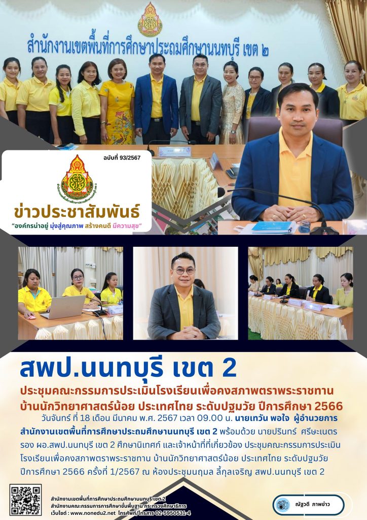 วันจันทร์ ที่ 18 เดือน มีนาคม พ.ศ. 2567 เวลา 09.00 น. นายเทวัน พอใจ ผู้อำนวยการสำนักงานเขตพื้นที่การศึกษาประถมศึกษานนทบุรี เขต 2 พร้อมด้วย นายปรินทร์ ศรีษะเนตร รอง ผอ.สพป.นนทบุรี เขต 2 ศึกษานิเทศก์ และเจ้าหน้าที่ที่เกี่ยวข้อง ประชุมคณะกรรมการประเมินโรงเรียนเพื่อคงสภาพตราพระราชทาน บ้านนักวิทยาศาสตร์น้อย ประเทศไทย ระดับปฐมวัย ปีการศึกษา 2566 ครั้งที่ 1/2567 ณ ห้องประชุมนฤมล ลี้กุลเจริญ สพป.นนทบุรี เขต 2