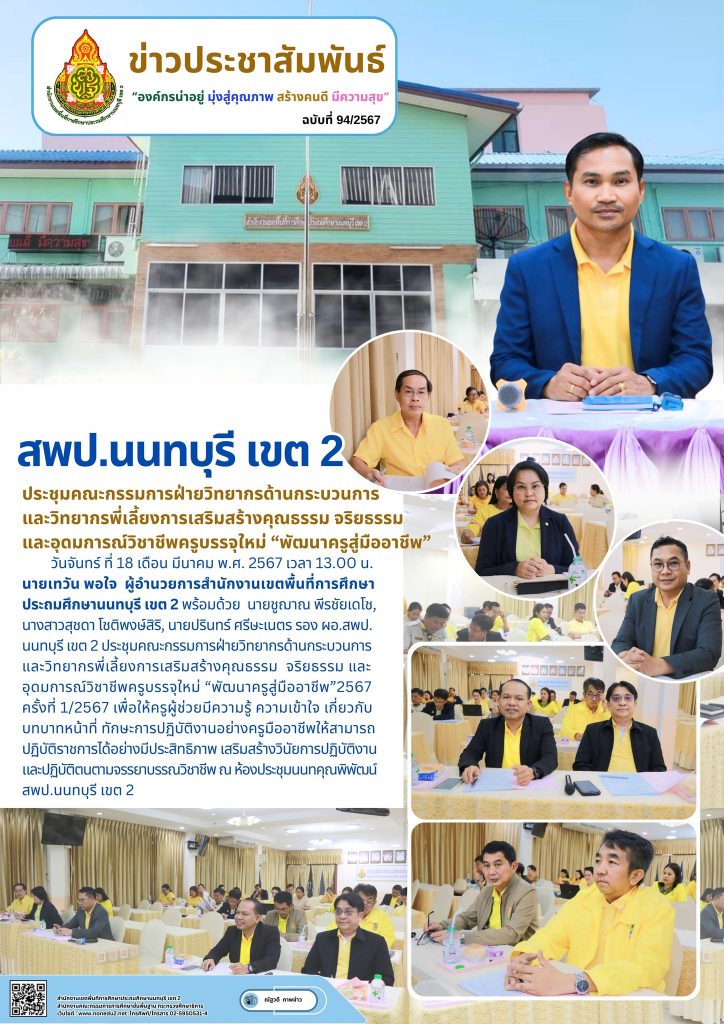 วันจันทร์ ที่ 18 เดือน มีนาคม พ.ศ. 2567 เวลา 13.00 น. นายเทวัน พอใจ ผู้อำนวยการสำนักงานเขตพื้นที่การศึกษาประถมศึกษานนทบุรี เขต 2 พร้อมด้วย นายชูฌาณ พีรชัยเดโช, นางสาวสุชดา โชติพงษ์สิริ, นายปรินทร์ ศรีษะเนตร รอง ผอ.สพป.นนทบุรี เขต 2 ประชุมคณะกรรมการฝ่ายวิทยากรด้านกระบวนการและวิทยากรพี่เลี้ยงการเสริมสร้างคุณธรรม จริยธรรม และอุดมการณ์วิชาชีพครูบรรจุใหม่ “พัฒนาครูสู่มืออาชีพ”2567 ครั้งที่ 1/2567 เพื่อให้ครูผู้ช่วยมีความรู้ ความเข้าใจ เกี่ยวกับบทบาทหน้าที่ ทักษะการปฏิบัติงานอย่างครูมืออาชีพให้สามารถปฏิบัติราชการได้อย่างมีประสิทธิภาพ เสริมสร้างวินัยการปฏิบัติงานและปฏิบัติตนตามจรรยาบรรณวิชาชีพ ณ ห้องประชุมนนทคุณพิพัฒน์ สพป.นนทบุรี เขต 2