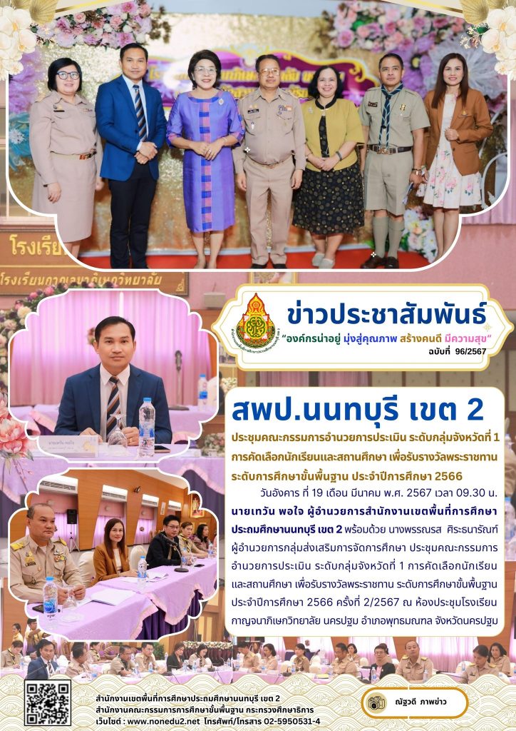 วันอังคาร ที่ 19 เดือน มีนาคม พ.ศ. 2567 เวลา 09.30 น. นายเทวัน พอใจ ผู้อำนวยการสำนักงานเขตพื้นที่การศึกษาประถมศึกษานนทบุรี เขต 2 พร้อมด้วย นางพรรณรส ศิระธนารัณฑ์ ผู้อำนวยการกลุ่มส่งเสริมการจัดการศึกษา ประชุมคณะกรรมการอำนวยการประเมิน ระดับกลุ่มจังหวัดที่ 1 การคัดเลือกนักเรียนและสถานศึกษา เพื่อรับรางวัลพระราชทาน ระดับการศึกษาขั้นพื้นฐานประจำปีการศึกษา 2566 ครั้งที่ 2/2567 ณ ห้องประชุมโรงเรียนกาญจนาภิเษกวิทยาลัย นครปฐม อำเภอพุทธมณฑล จังหวัดนครปฐม