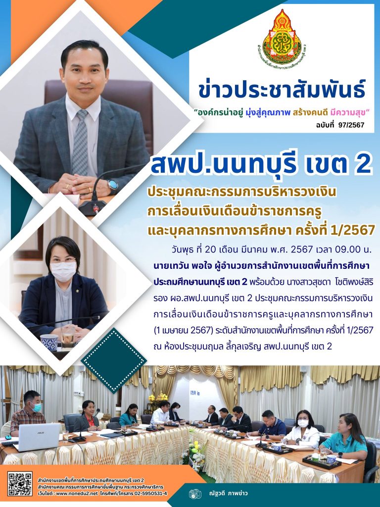 วันพุธ ที่ 20 เดือน มีนาคม พ.ศ. 2567 เวลา 09.00 น. นายเทวัน พอใจ ผู้อำนวยการสำนักงานเขตพื้นที่การศึกษาประถมศึกษานนทบุรี เขต 2 พร้อมด้วย นางสาวสุชดา โชติพงษ์สิริ รอง ผอ.สพป.นนทบุรี เขต 2 ประชุมคณะกรรมการบริหารวงเงินการเลื่อนเงินเดือนข้าราชการครูและบุคลากรทางการศึกษา (1 เมษายน 2567) ระดับสำนักงานเขตพื้นที่การศึกษา ครั้งที่ 1/2567 ณ ห้องประชุมนฤมล ลี้กุลเจริญ สพป.นนทบุรี เขต 2