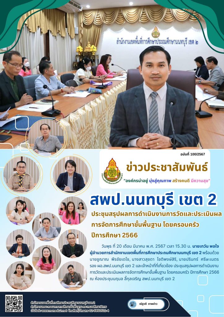 วันพุธ ที่ 20 เดือน มีนาคม พ.ศ. 2567 เวลา 15.30 น. นายเทวัน พอใจ ผู้อำนวยการสำนักงานเขตพื้นที่การศึกษาประถมศึกษานนทบุรี เขต 2 พร้อมด้วย นายชูฌาณ พีรชัยเดโช, นางสาวสุชดา โชติพงษ์สิริ, นายปรินทร์ ศรีษะเนตร รอง ผอ.สพป.นนทบุรี เขต 2 และเจ้าหน้าที่ที่เกี่ยวข้อง ประชุมสรุปผลการดำเนินงานการวัดและประเมินผลการจัดการศึกษาขั้นพื้นฐาน โดยครอบครัว ปีการศึกษา 2566 ณ ห้องประชุมนฤมล ลี้กุลเจริญ สพป.นนทบุรี เขต 2