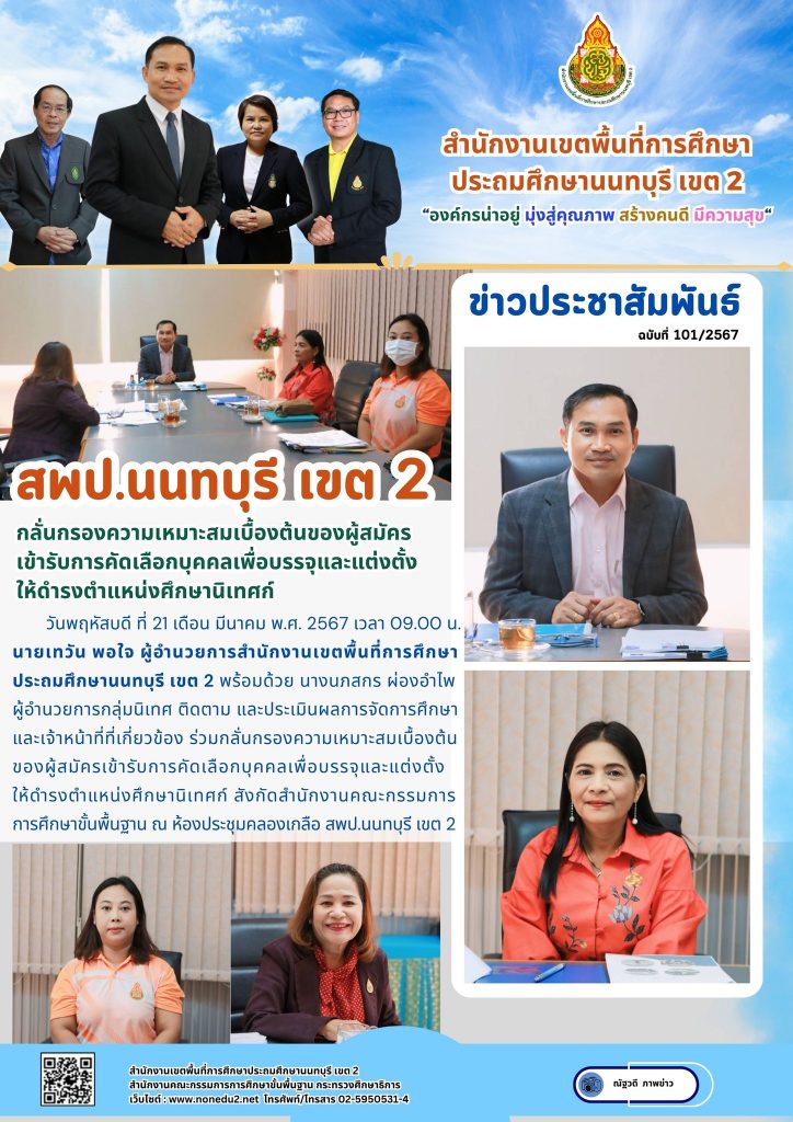 วันพฤหัสบดี ที่ 21 เดือน มีนาคม พ.ศ. 2567 เวลา 09.00 น. นายเทวัน พอใจ ผู้อำนวยการสำนักงานเขตพื้นที่การศึกษาประถมศึกษานนทบุรี เขต 2 พร้อมด้วย นางนภสกร ผ่องอำไพ ผู้อำนวยการกลุ่มนิเทศ ติดตาม และประเมินผลการจัดการศึกษาและเจ้าหน้าที่ที่เกี่ยวข้อง ร่วมกลั่นกรองความเหมาะสมเบื้องต้นของผู้สมัครเข้ารับการคัดเลือกบุคคลเพื่อบรรจุและแต่งตั้งให้ดำรงตำแหน่งศึกษานิเทศก์ สังกัดสำนักงานคณะกรรมการการศึกษาขั้นพื้นฐาน ณ ห้องประชุมคลองเกลือ สพป.นนทบุรี เขต 2
