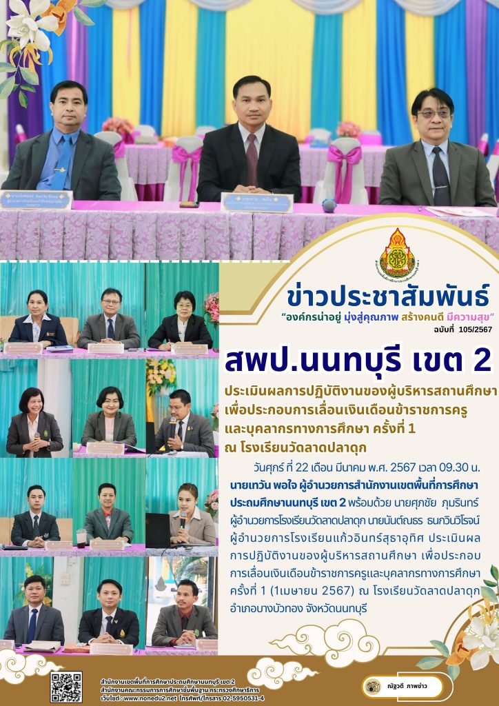 วันศุกร์ ที่ 22 เดือน มีนาคม พ.ศ. 2567 เวลา 09.30 น. นายเทวัน พอใจ ผู้อำนวยการสำนักงานเขตพื้นที่การศึกษาประถมศึกษานนทบุรี เขต 2 พร้อมด้วย นายศุภชัย ภุมรินทร์ ผู้อำนวยการโรงเรียนวัดลาดปลาดุก นายนันต์ณธร ธนกวินวิโรจน์ ผู้อำนวยการโรงเรียนแก้วอินทร์สุธาอุทิศ ประเมินผลการปฏิบัติงานของผู้บริหารสถานศึกษา เพื่อประกอบการเลื่อนเงินเดือนข้าราชการครูและบุคลากรทางการศึกษา ครั้งที่ 1 (1เมษายน 2567) ณ โรงเรียนวัดลาดปลาดุก อำเภอบางบัวทอง จังหวัดนนทบุรี
