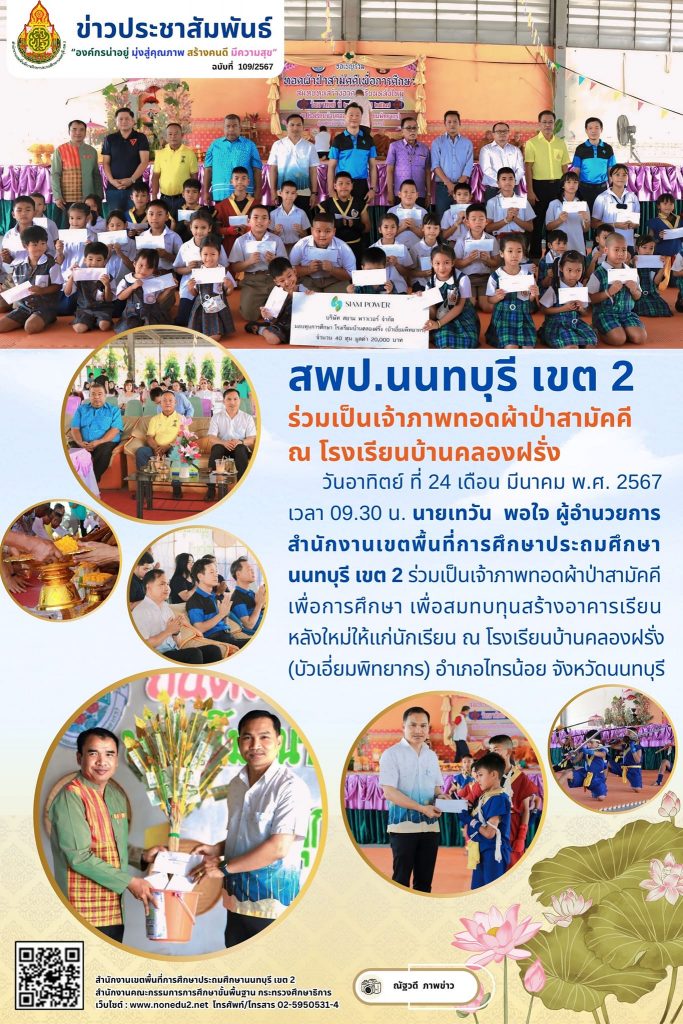 วันอาทิตย์ ที่ 24 เดือน มีนาคม พ.ศ. 2567 เวลา 09.30 น. นายเทวัน พอใจ ผู้อำนวยการสำนักงานเขตพื้นที่การศึกษาประถมศึกษานนทบุรี เขต 2 ร่วมเป็นเจ้าภาพทอดผ้าป่าสามัคคีเพื่อการศึกษา เพื่อสมทบทุนสร้างอาคารเรียนหลังใหม่ให้แก่นักเรียน ณ โรงเรียนบ้านคลองฝรั่ง (บัวเอี่ยมพิทยากร) อำเภอไทรน้อย จังหวัดนนทบุรี