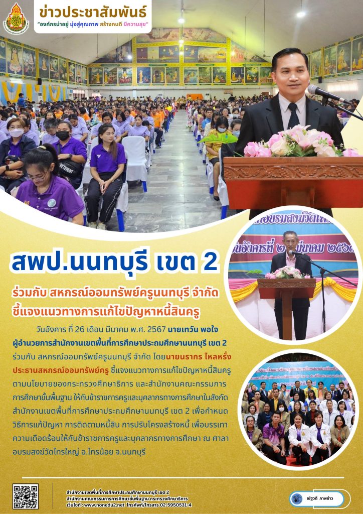 วันอังคาร ที่ 26 เดือน มีนาคม พ.ศ. 2567 นายเทวัน พอใจ ผู้อำนวยการสำนักงานเขตพื้นที่การศึกษาประถมศึกษานนทบุรี เขต 2 ร่วมกับ สหกรณ์ออมทรัพย์ครูนนทบุรี จำกัด โดยนายนรากร ไหลหรั่ง ประธานสหกรณ์ออมทรัพย์ครู ชี้แจงแนวทางการแก้ไขปัญหาหนี้สินครูตามนโยบายของกระทรวงศึกษาธิการ และสำนักงานคณะกรรมการการศึกษาขั้นพื้นฐาน ให้กับข้าราชการครูและบุคลากรทางการศึกษาในสังกัดสำนักงานเขตพื้นที่การศึกษาประถมศึกษานนทบุรี เขต 2 เพื่อกำหนดวิธีการแก้ปัญหา การติดตามหนี้สิน การปรับโครงสร้างหนี้ เพื่อบรรเทาความเดือดร้อนให้กับข้าราชการครูและบุคลากรทางการศึกษา ณ ศาลาอบรมสงฆ์วัดไทรใหญ่ อ.ไทรน้อย จ.นนทบุรี