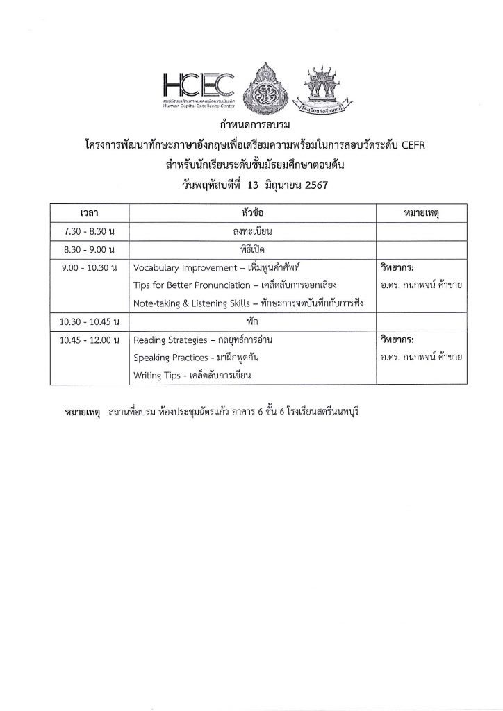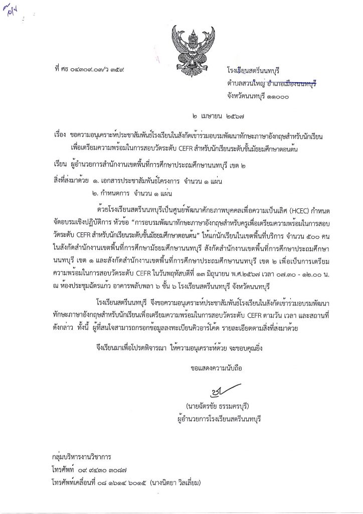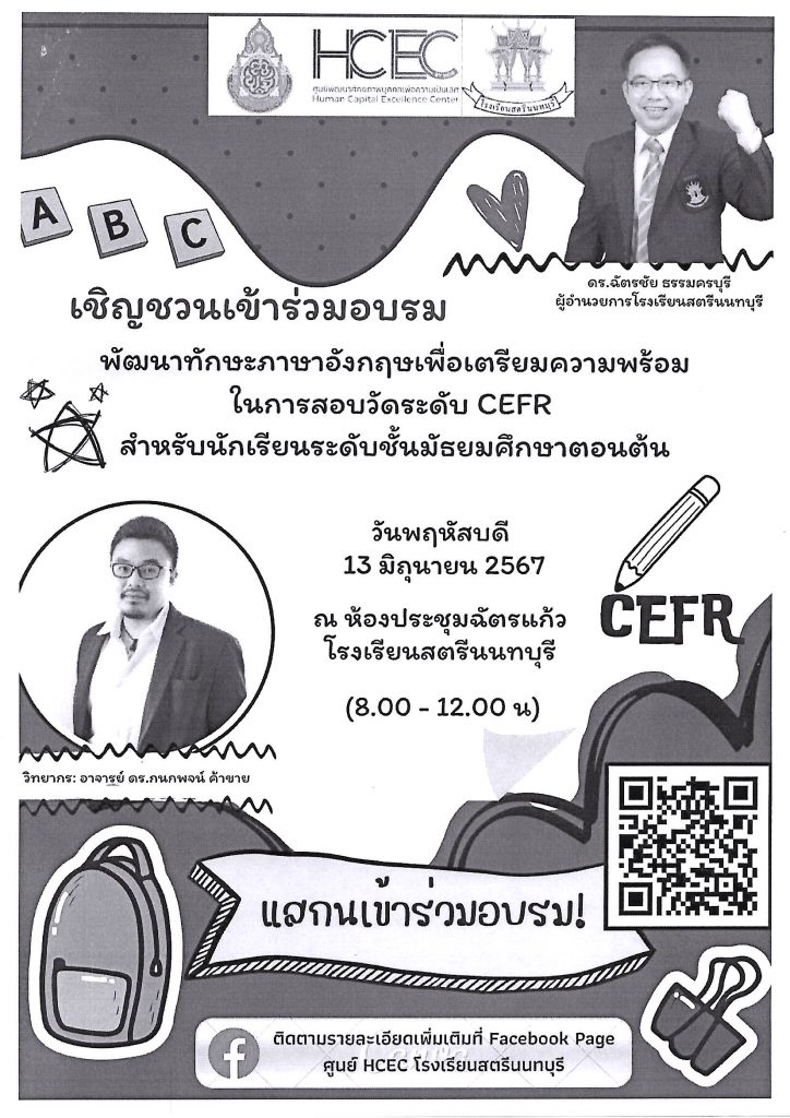 ประชาสัมพันธ์การอบรมพัฒนาทักษะภาษาอังกฤษสำหรับนักเรียนเพื่อเตรียมความพร้อมในการสอบวัดระดับ CEFR สำหรับนักเรียนระดับชั้นมัธยมศึกษาตอนต้น เพื่อเป็นการเตรียมความพร้อมในการสอบวัดระดับ CEFR ในวันพฤหัสบดีที่ 13 มิถุนายน พ.ศ.2567 เวลา 07.30 – 12.00 น. ณ ห้องประชุมฉัตรแก้ว อาคารพลับพลา 6 ชั้น 6 โรงเรียนสตรีนนทบุรี ผู้ที่สนใจสามารถกรอกข้อมูลลงทะเบียนคิวอาร์โค้ด รายละเอียดตามสิ่งที่ส่งมาด้วย