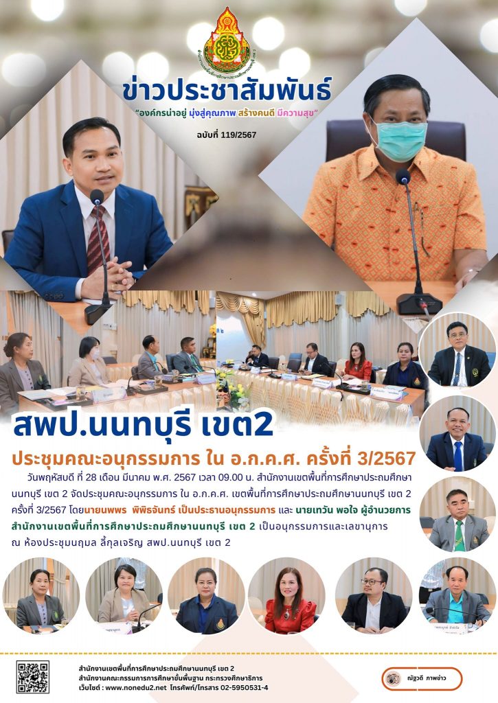 วันพฤหัสบดี ที่ 28 เดือน มีนาคม พ.ศ. 2567 เวลา 09.00 น. สำนักงานเขตพื้นที่การศึกษาประถมศึกษานนทบุรี เขต 2 จัดประชุมคณะอนุกรรมการ ใน อ.ก.ค.ศ. เขตพื้นที่การศึกษาประถมศึกษานนทบุรี เขต 2 ครั้งที่ 3/2567 โดยนายนพพร พิพิธจันทร์ เป็นประธานอนุกรรมการ และ นายเทวัน พอใจ ผู้อำนวยการสำนักงานเขตพื้นที่การศึกษาประถมศึกษานนทบุรี เขต 2 เป็นอนุกรรมการและเลขานุการ ณ ห้องประชุมนฤมล ลี้กุลเจริญ สพป.นนทบุรี เขต 2